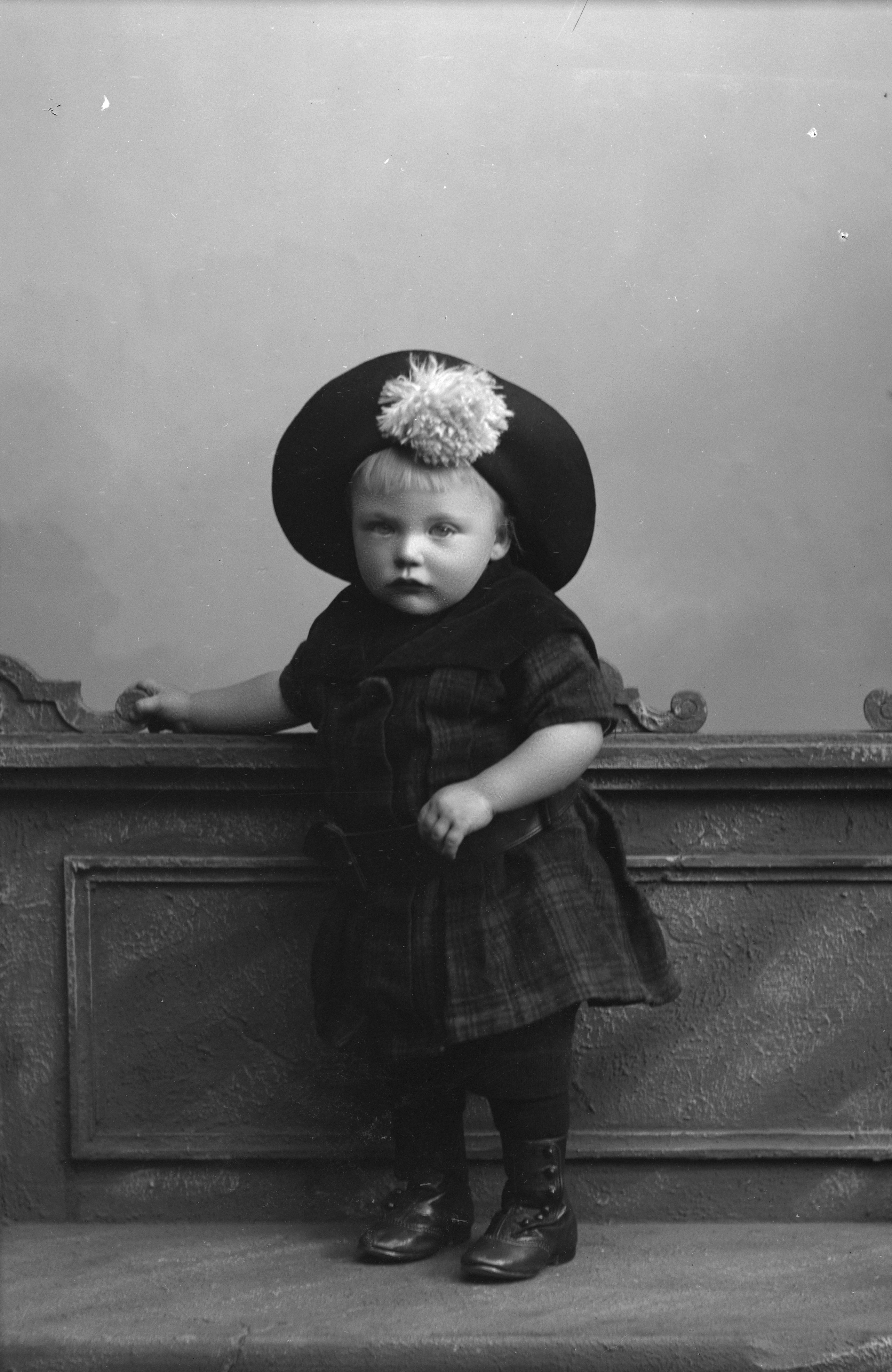 Porträtt i helfigur av herr Hermanssons son, iklädd mössa, stående på bänk.