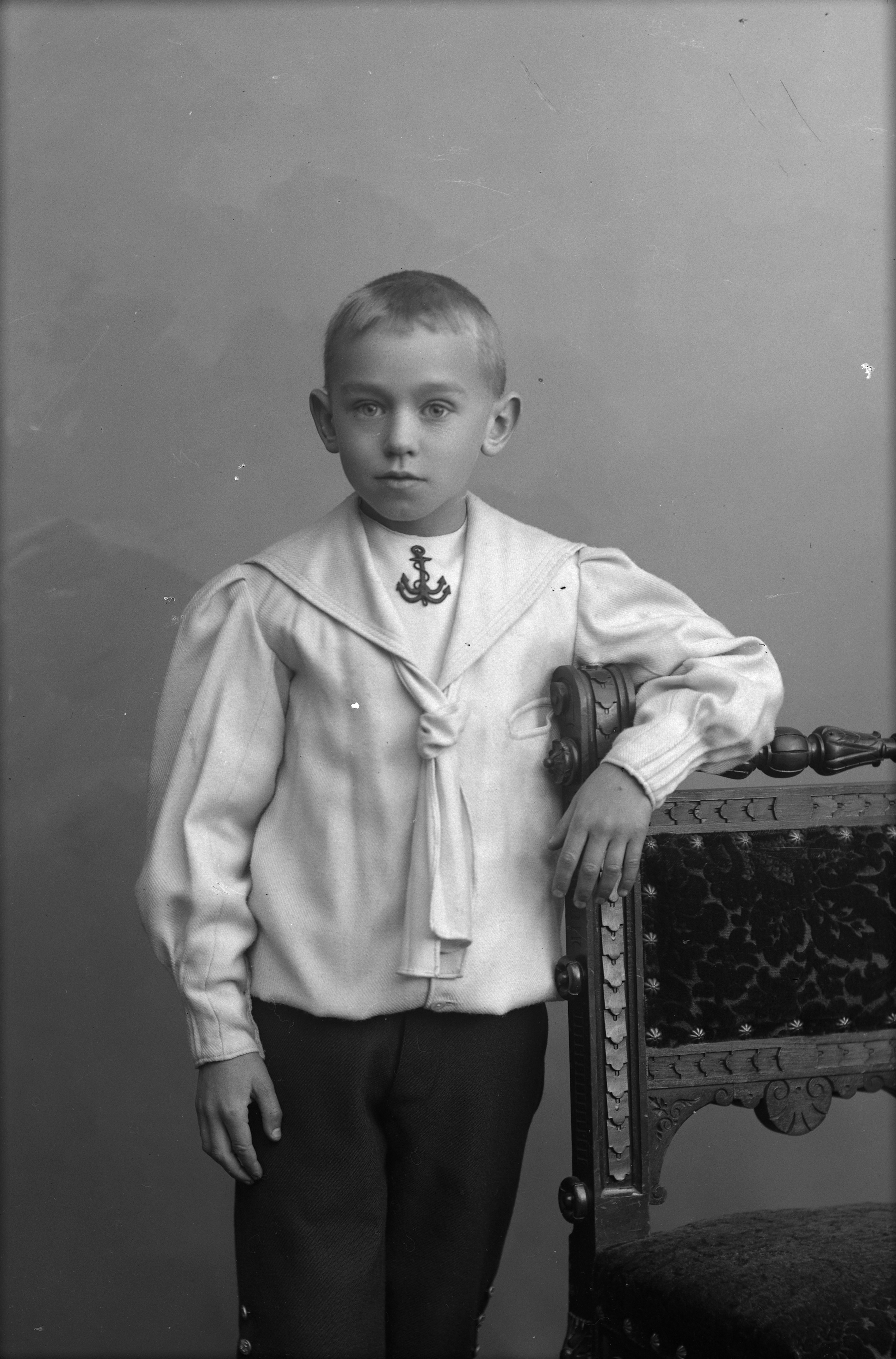 Porträtt i helfigur av fru Malmgrens son, iklädd sjömanskostym, stående vid stol.