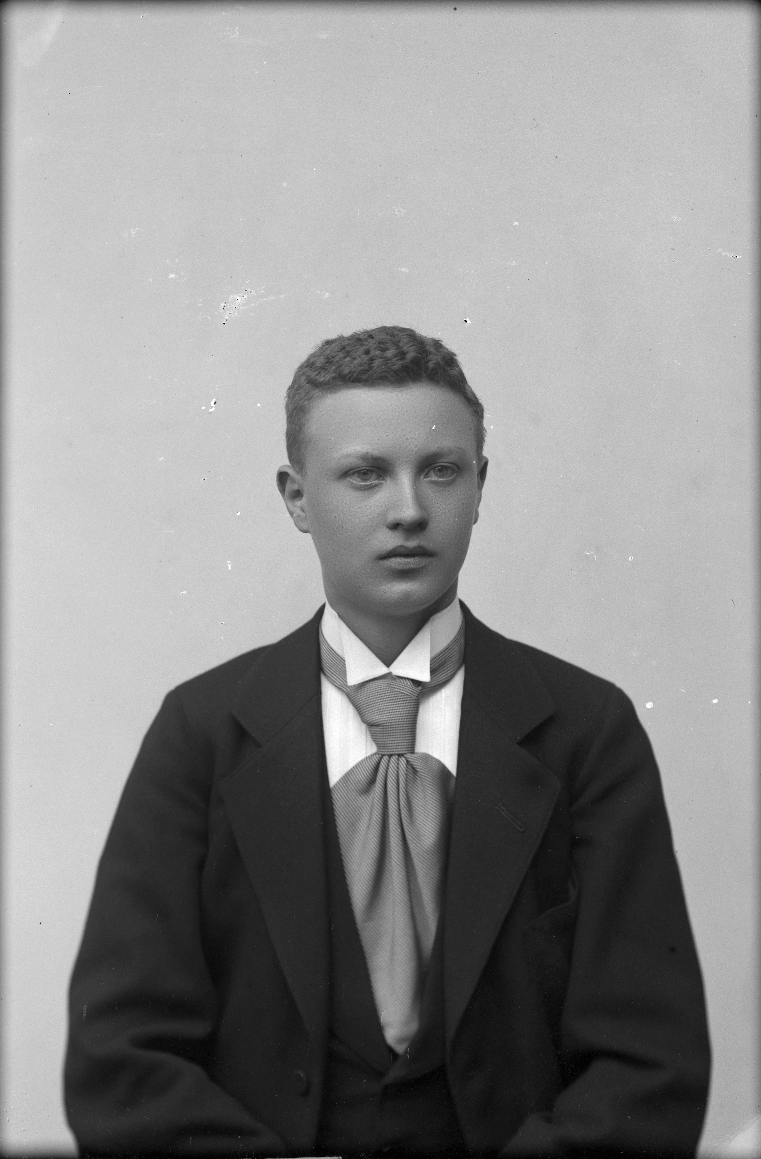 Beskrivning: Porträtt i halvfigur av Johan Ekdahl vid Baudes Café.