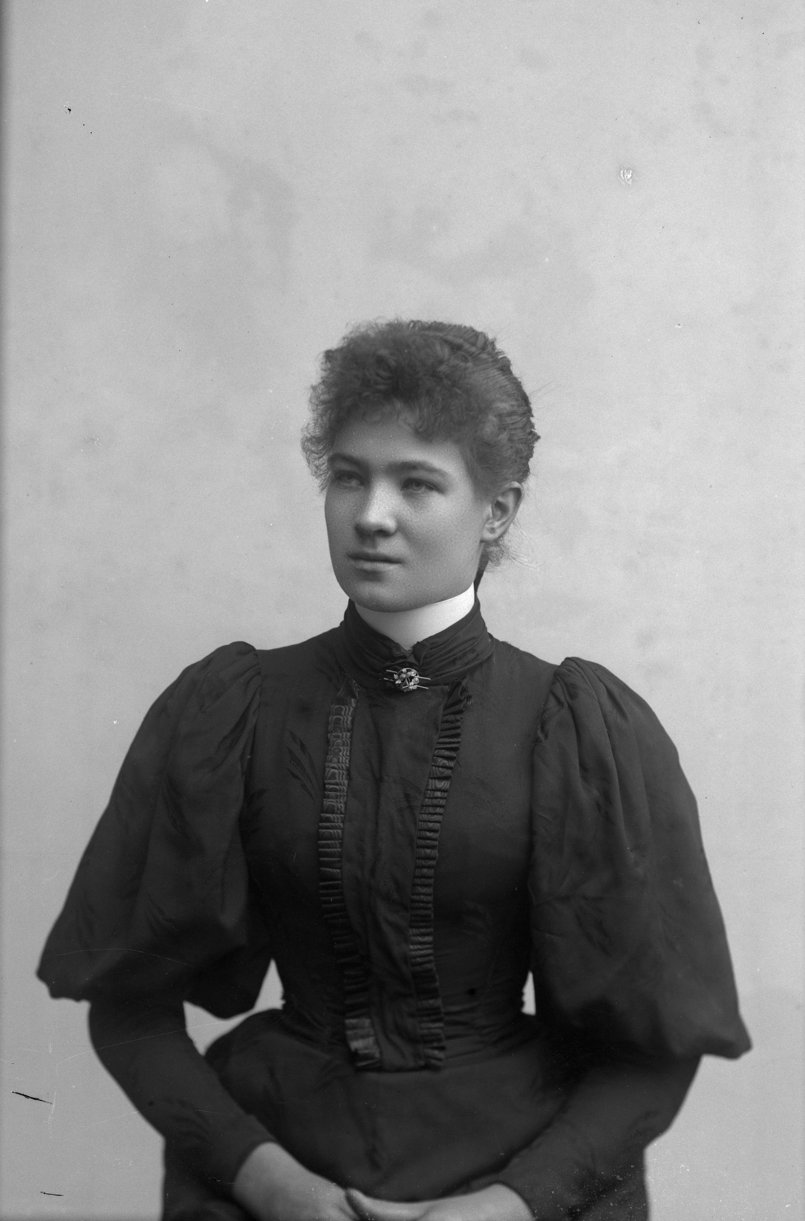 Beskrivning: Porträtt i halvfigur av Vilhelmina Nilson.