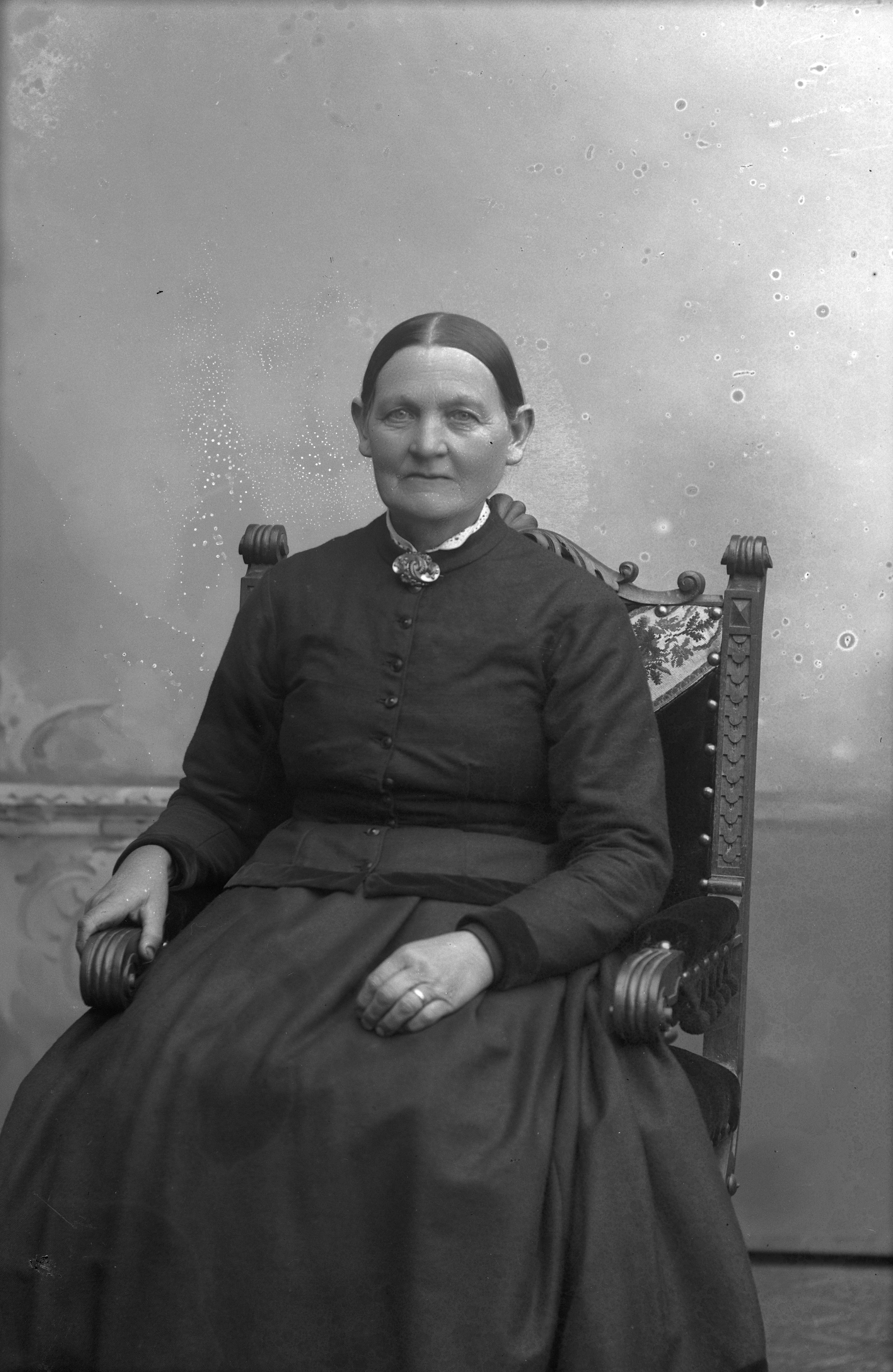 Porträtt i helfigur av Krister Olsson fru, sittande i stol.