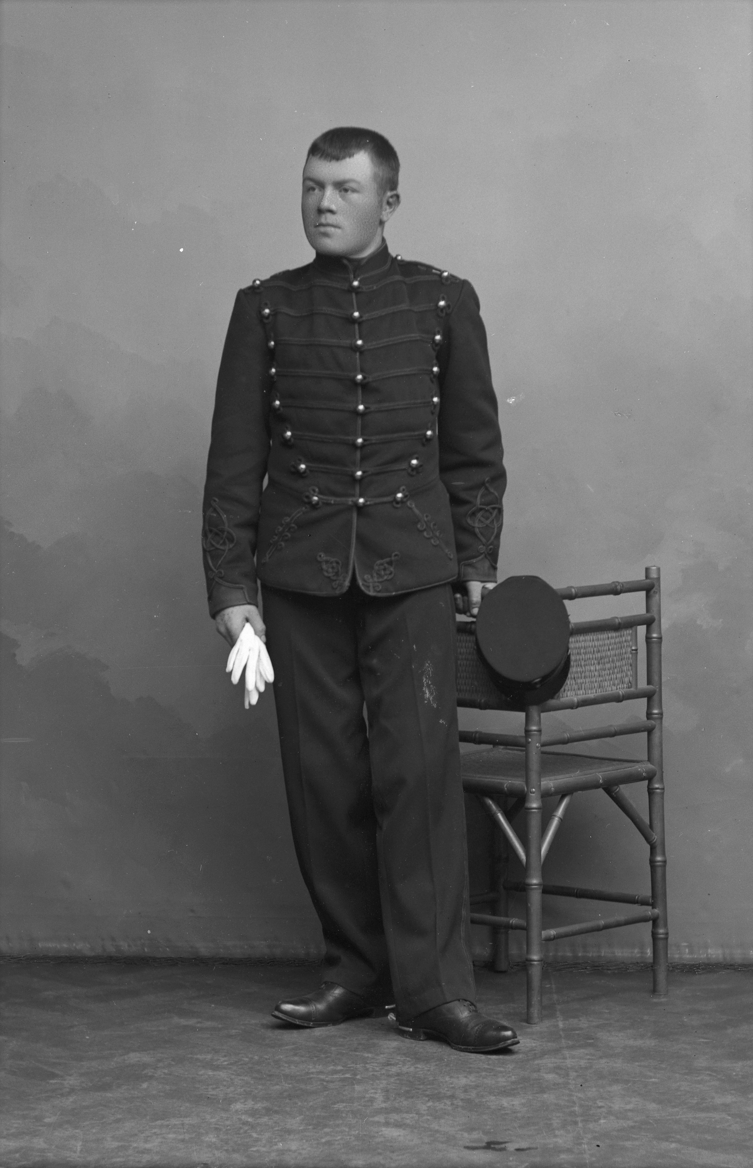 Porträtt i helfigur N. Nilsson, iklädd militäruniform, hållande mössa, stående vid stol.