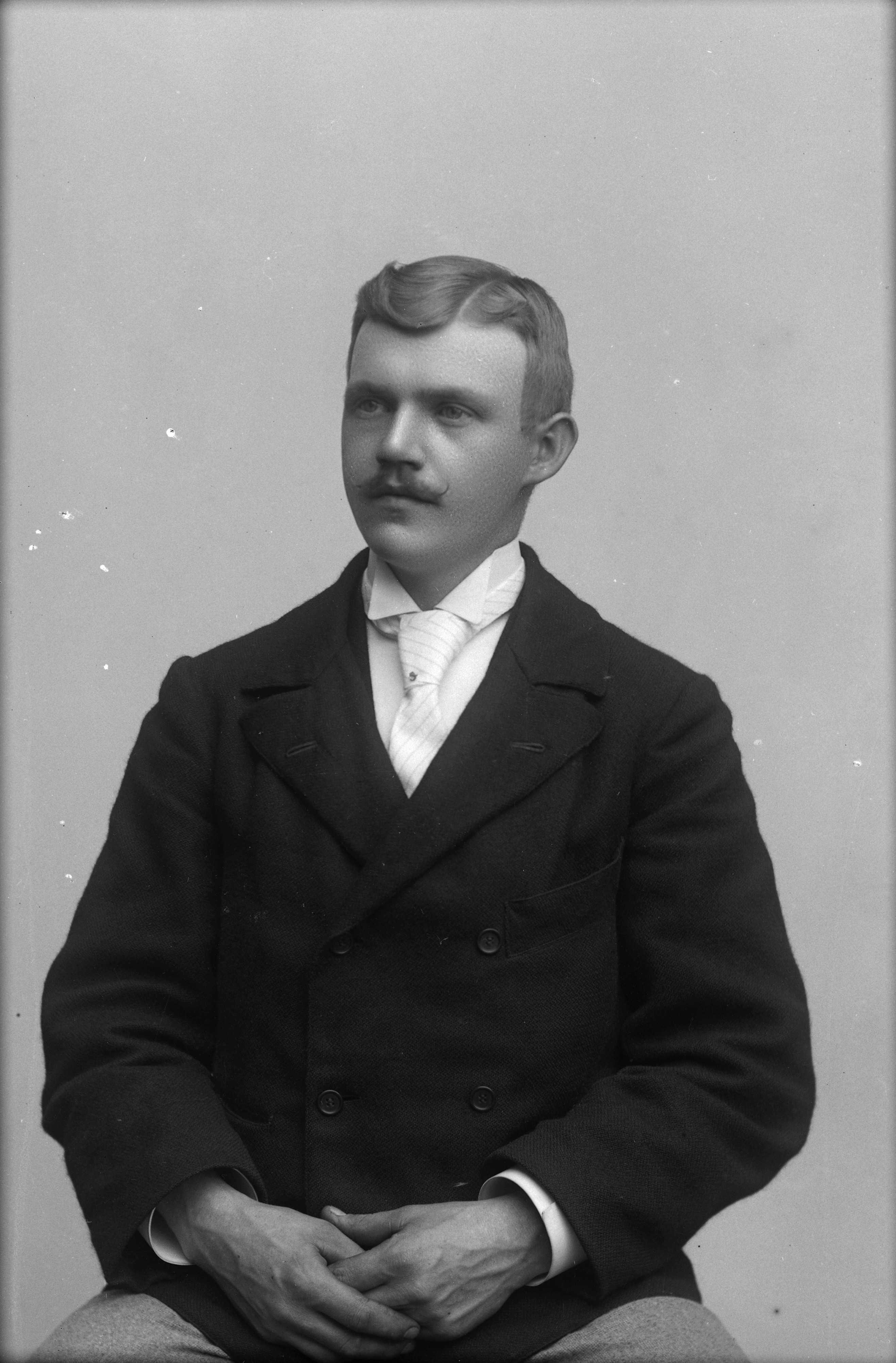 Beskrivning: Porträtt i halvfigur av mejerist G. Larsson.