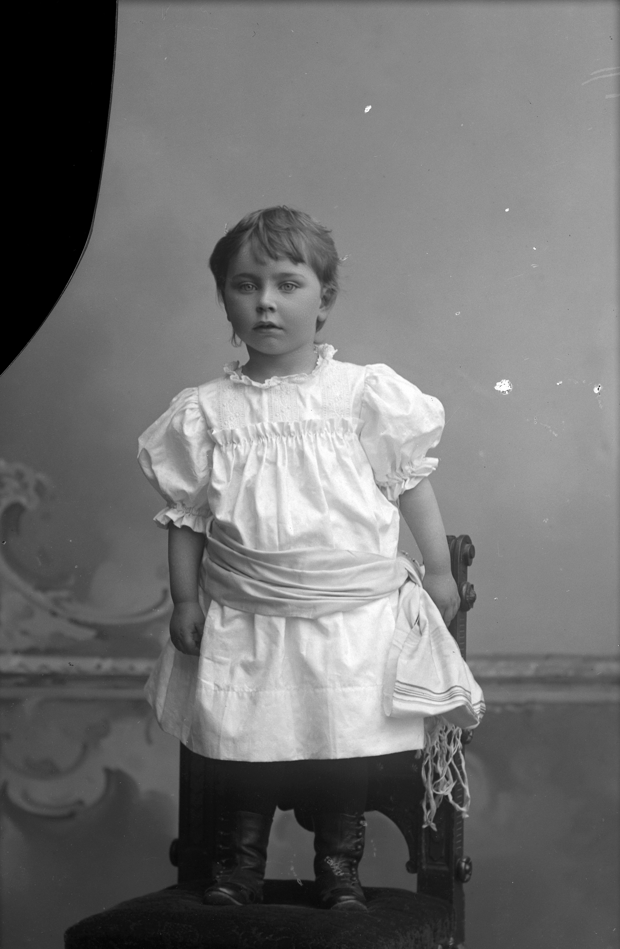 Porträtt i helfigur av fru Möllers dotter, stående på stol.