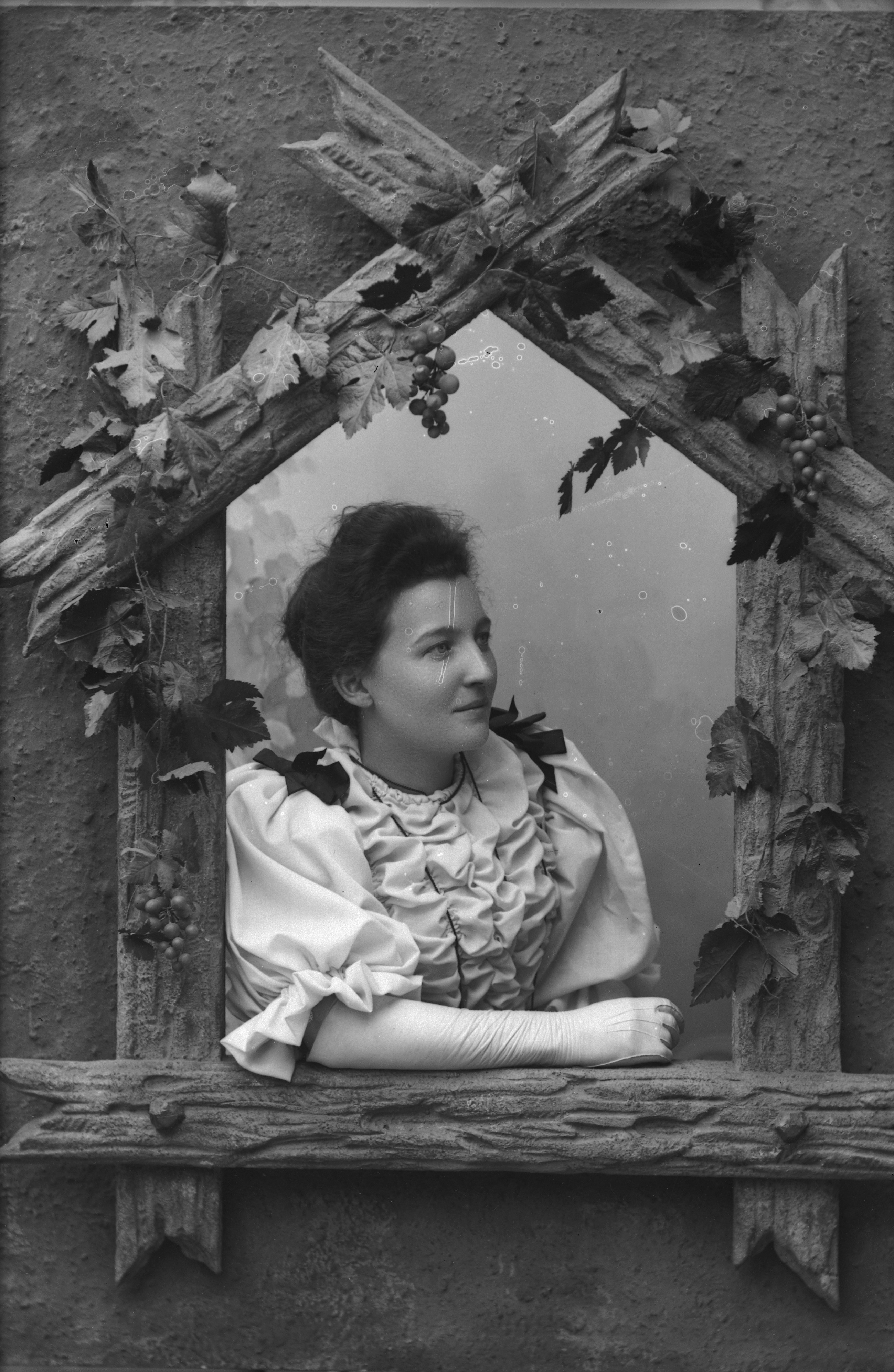 Porträtt i halvfigur av fröken Johansson, fotograferad sittande i fönsterkuliss dekorerad med vinranka.