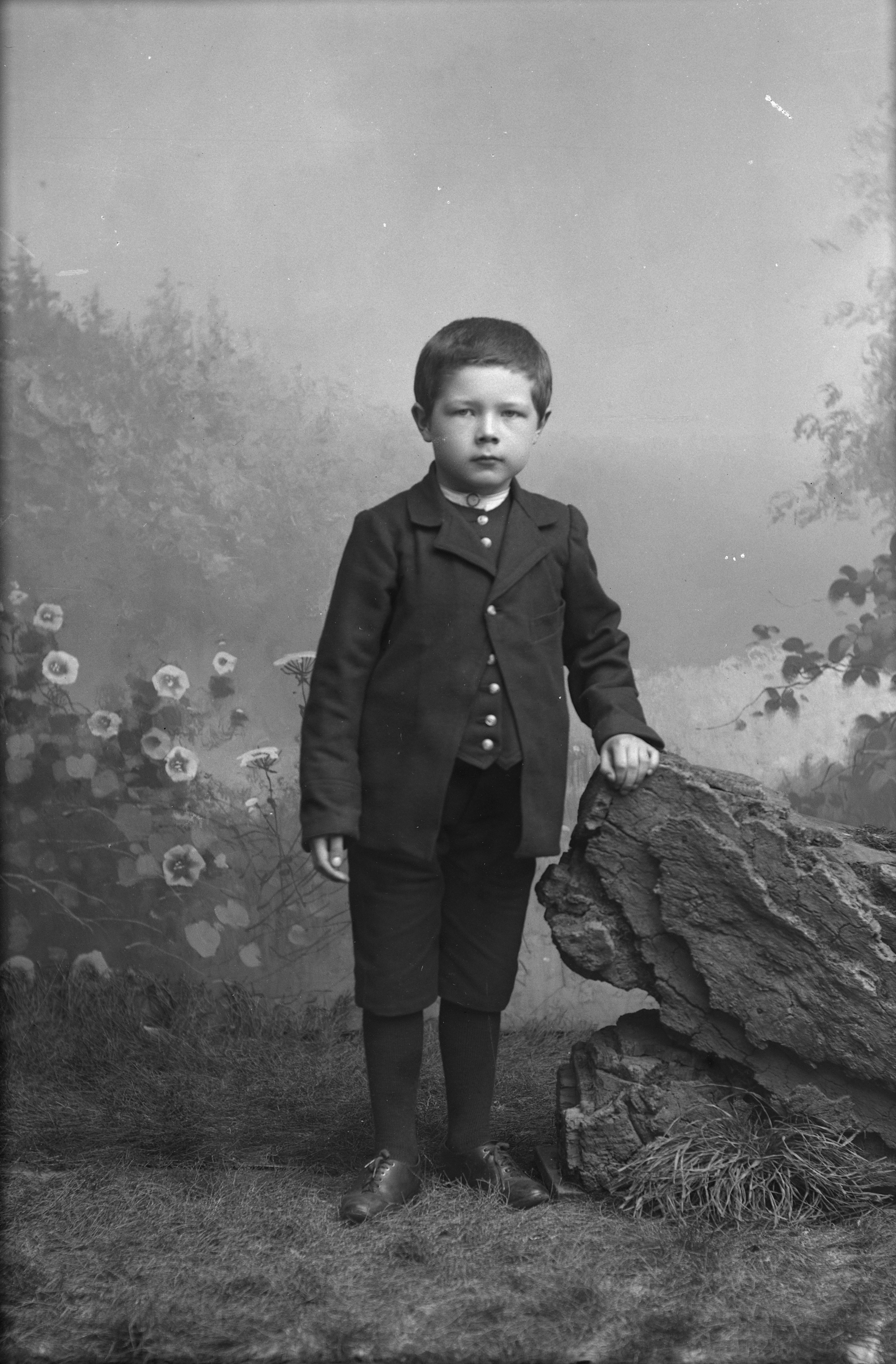 Porträtt i helfigur av fru Agerups son, iklädd sjömanskostym, stående invid stenhäll.