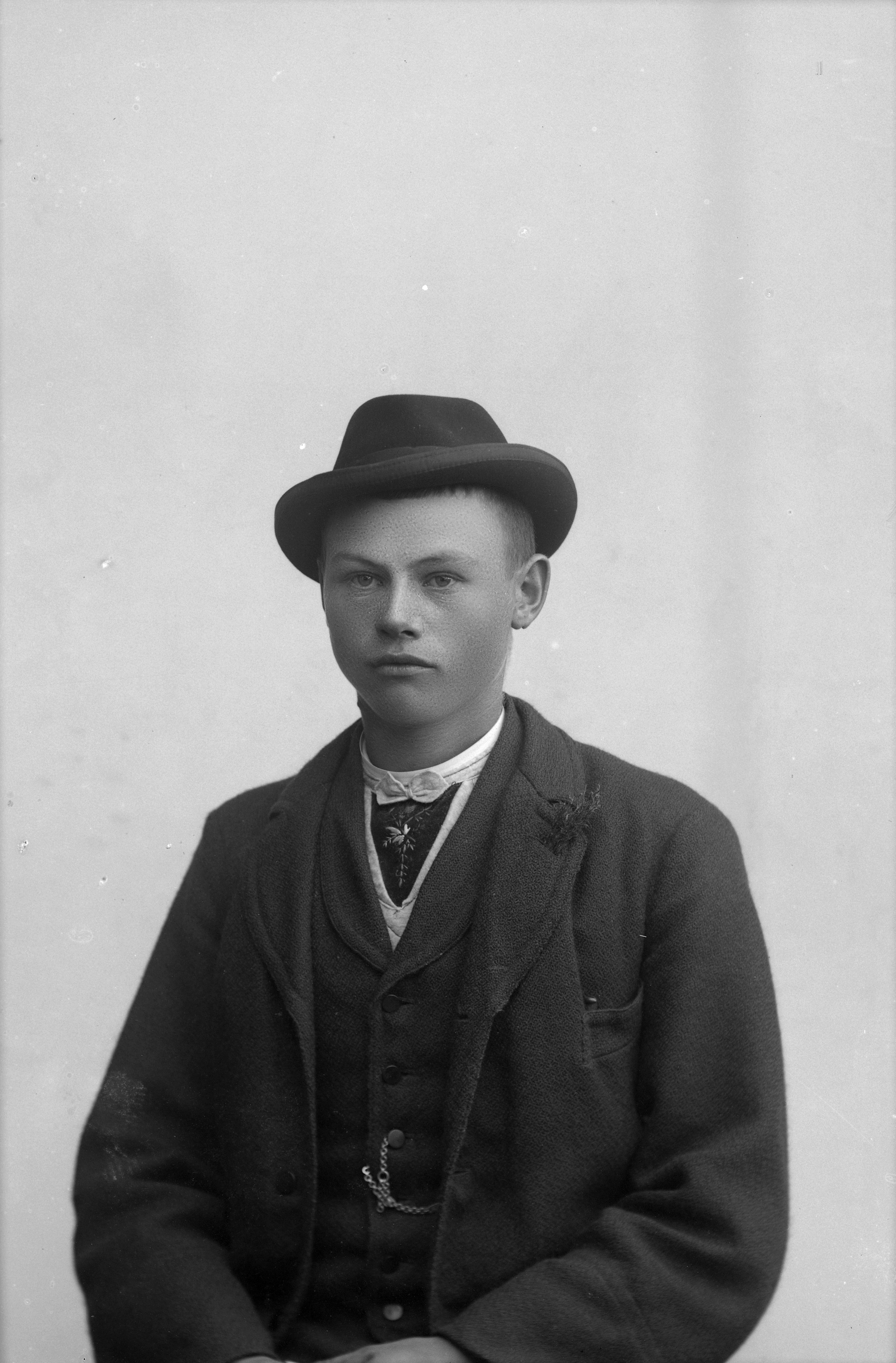 Porträtt i halvfigur av O. Jönsson, iklädd hatt.