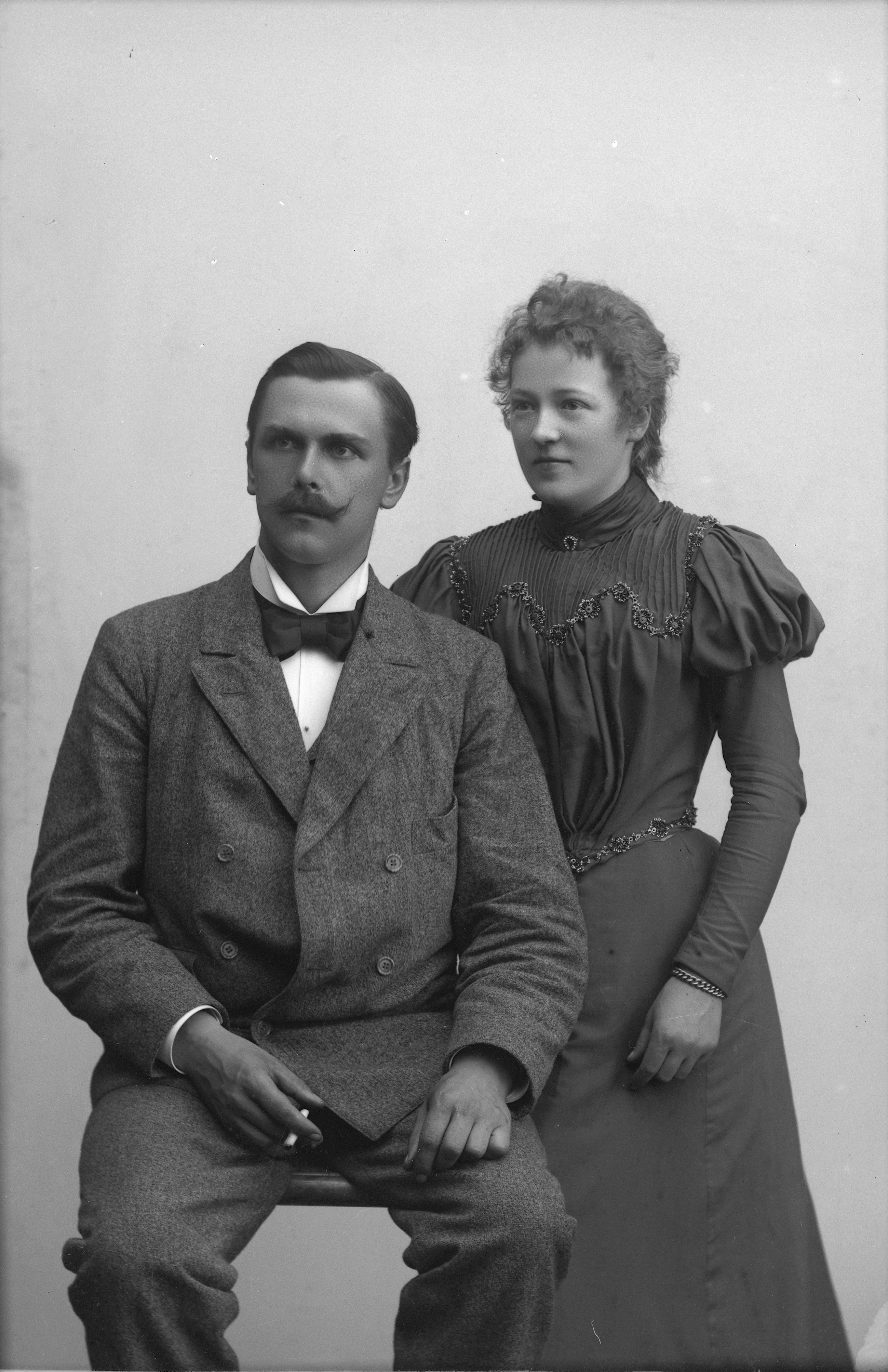 Beskrivning: Porträtt i helfigur av E. Kollind med fru.