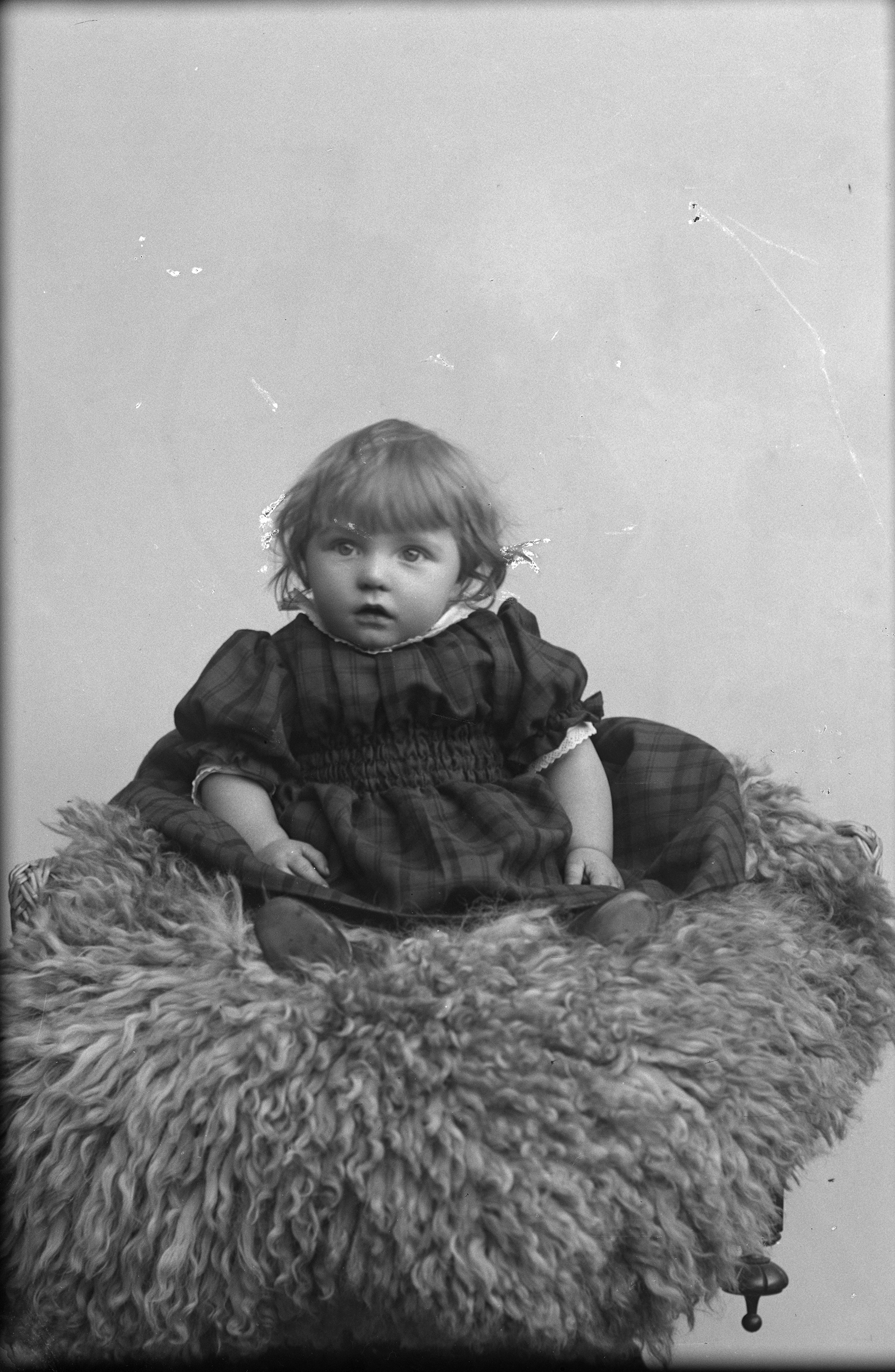 Porträtt i helfigur av fru Ekmans son, sittande på fäll.