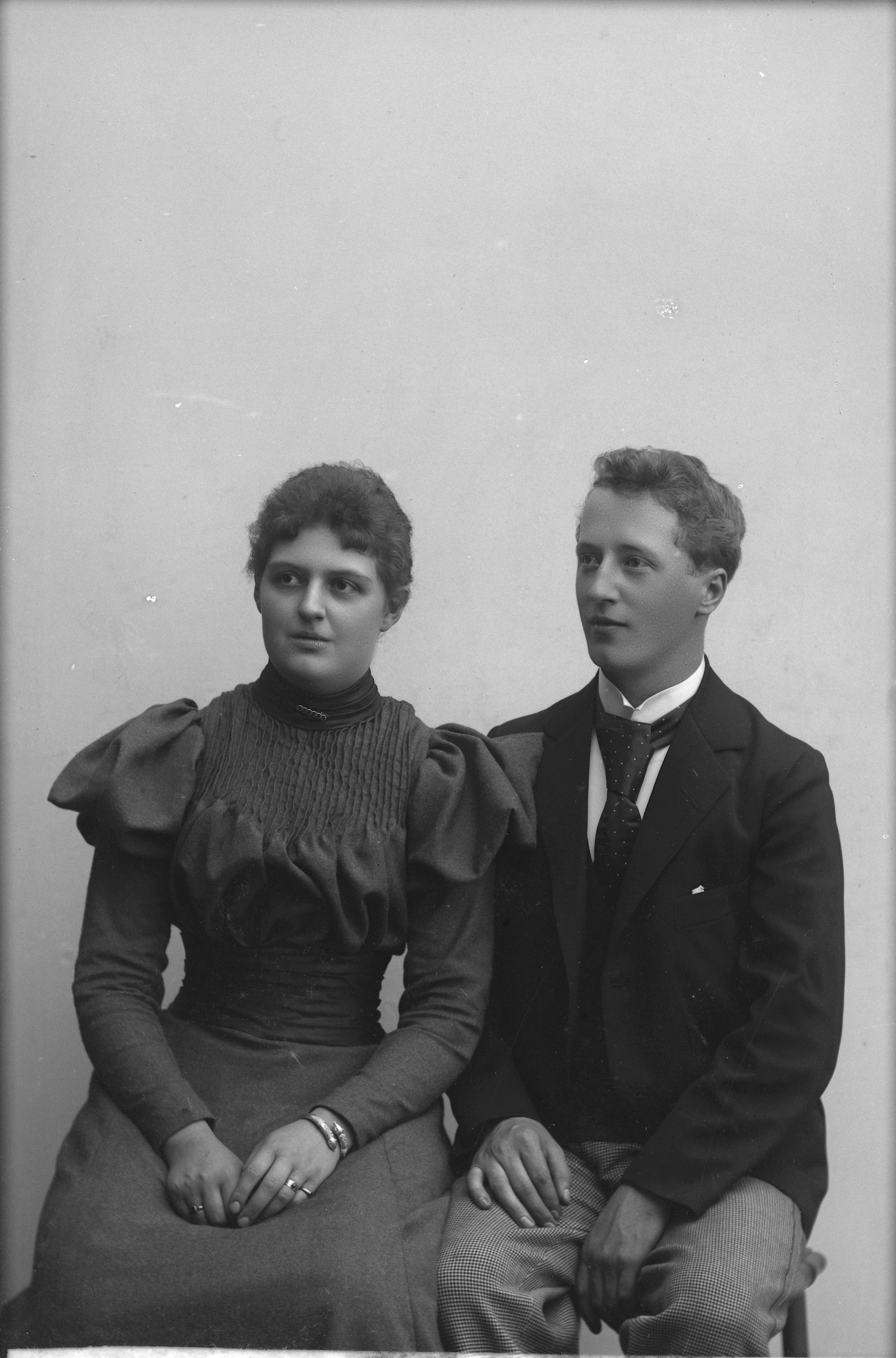 Beskrivning: Porträtt i helfigur av K. Karlsson med fru.