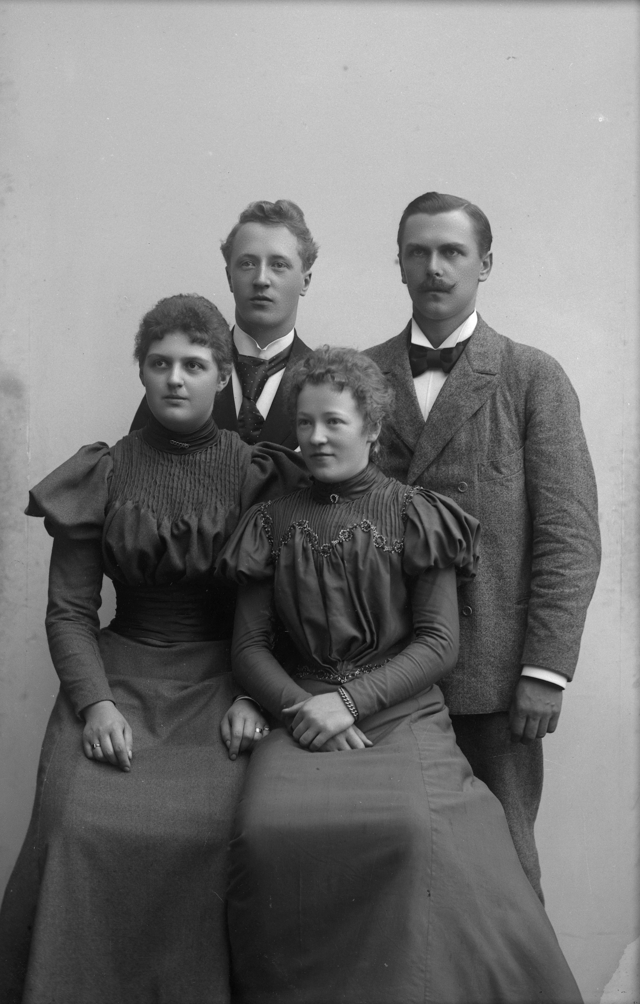 Beskrivning: Porträtt i helfigur av K. Karlsson och E. Kollind med fruar. Fruarna sittande.