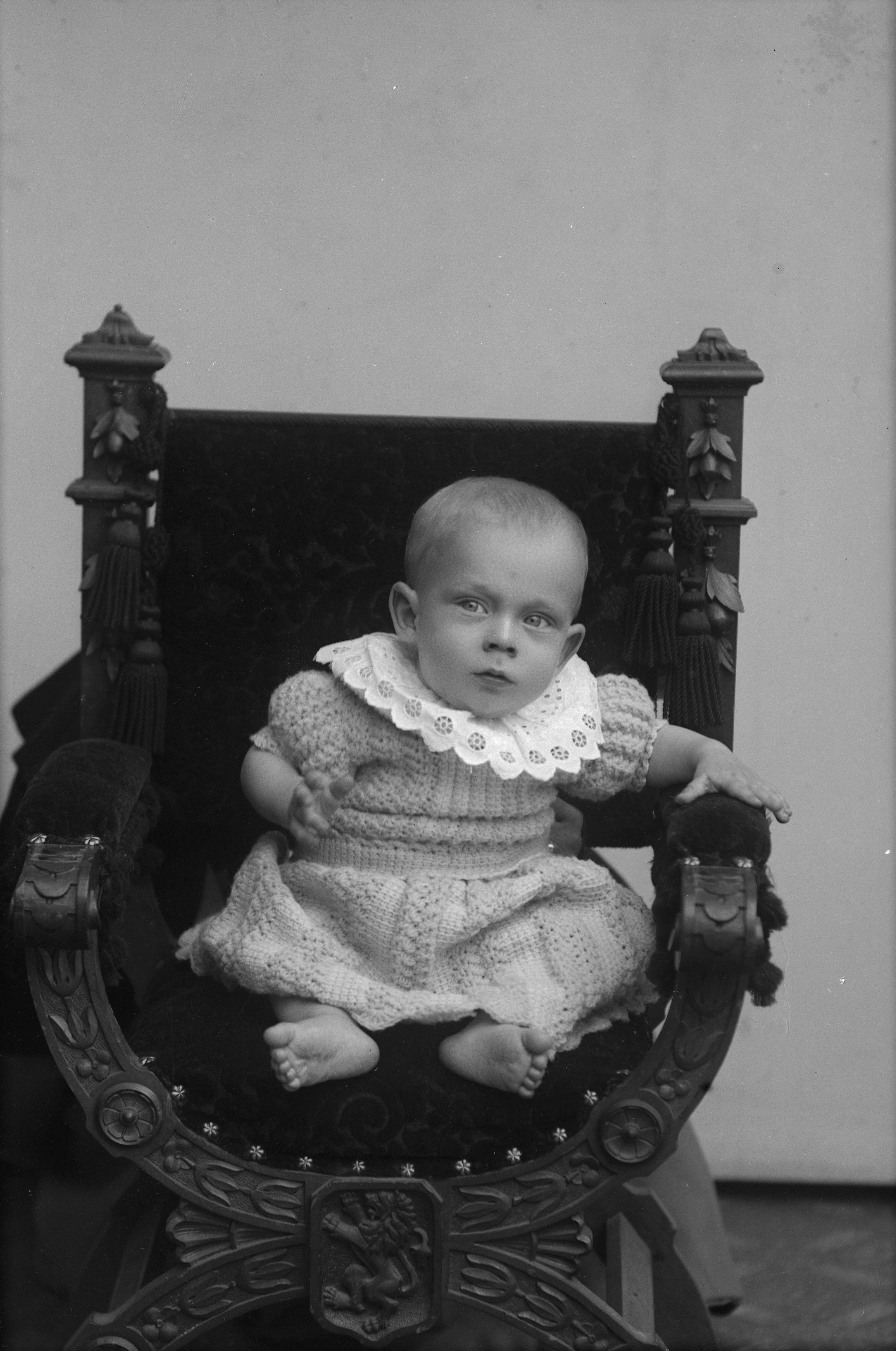 Porträtt i helfigur av Emmy Carlssons son, sittande i munkstol.