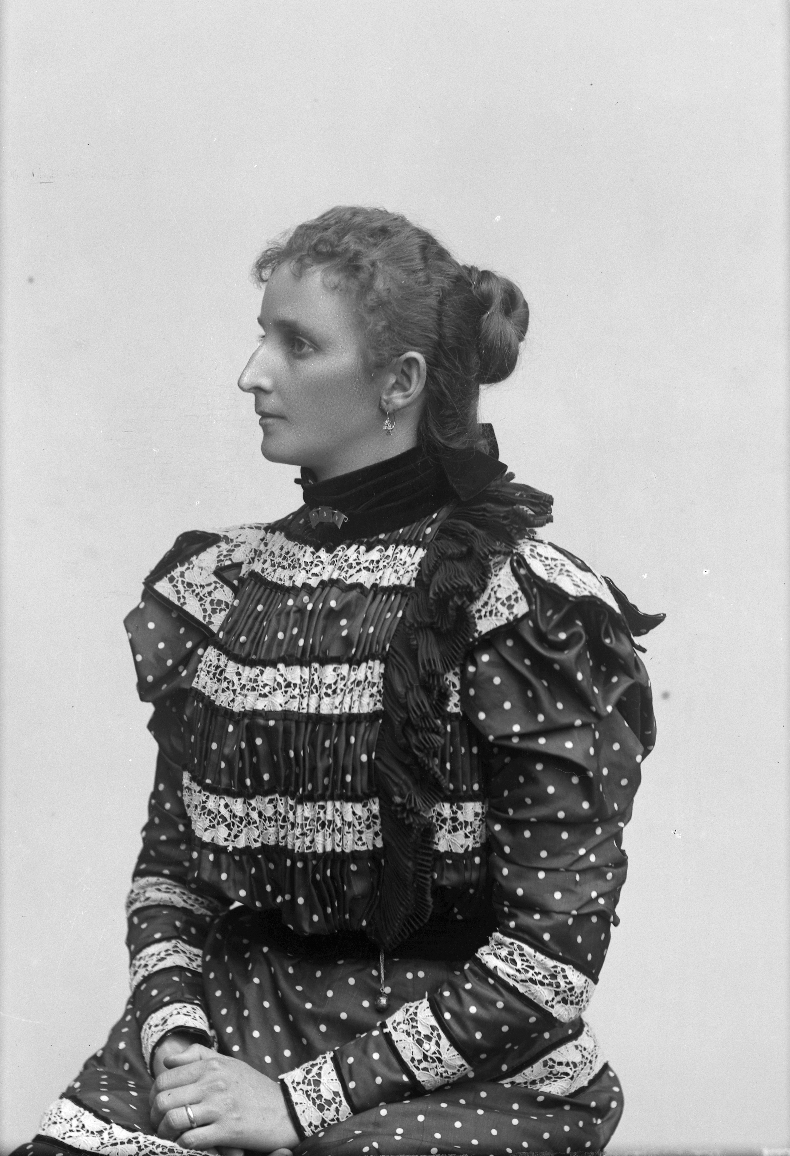 Porträtt i halvfigur av fru Vesterman, ansikte i profil.