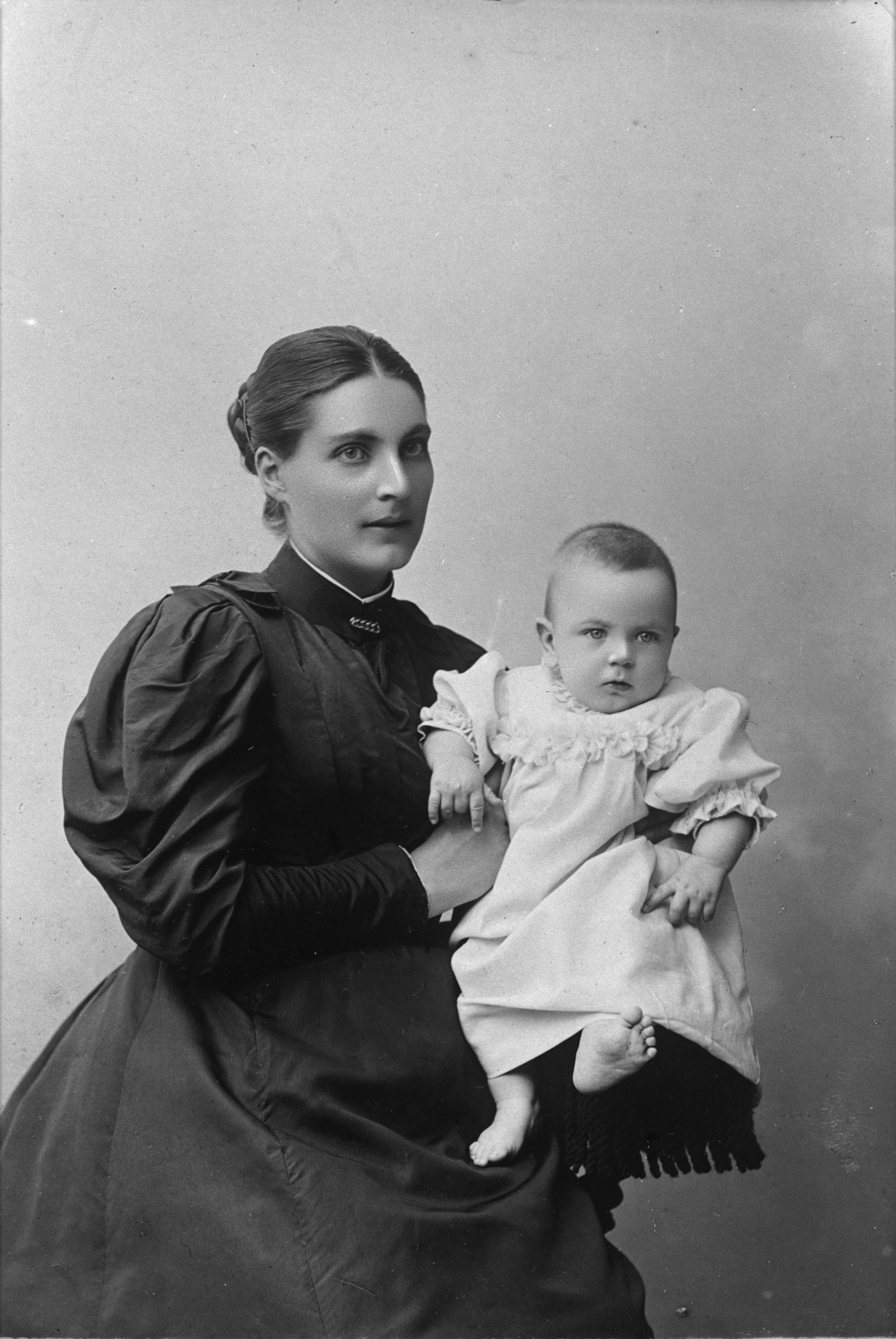 Porträtt i helfigur av Ida Maria Ulrika Billing, hållande sitt barn i famnen.