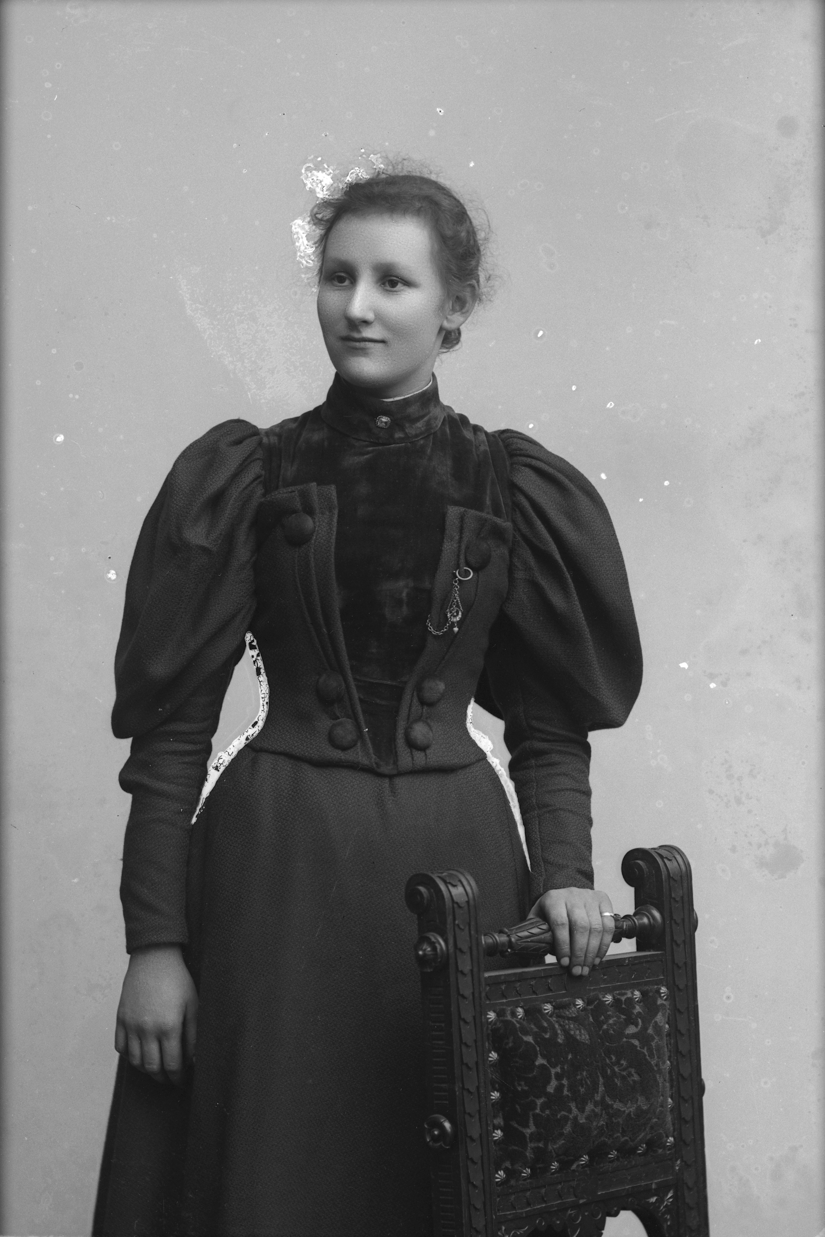 Porträtt i helfigur av Augusta Bergström, stående vid stol.