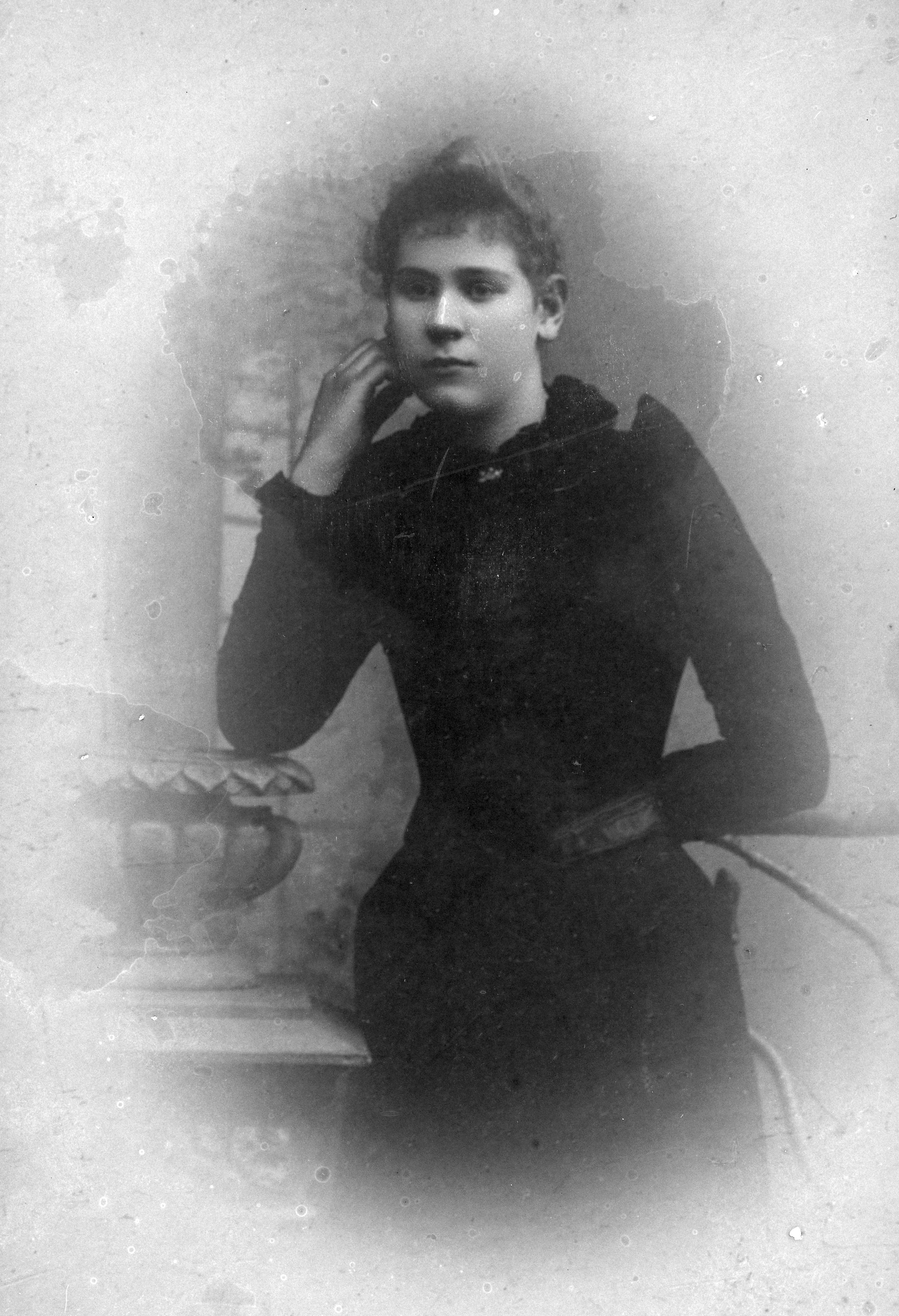 Beskrivning: Porträtt i helfigur av oidentifierad kvinna.