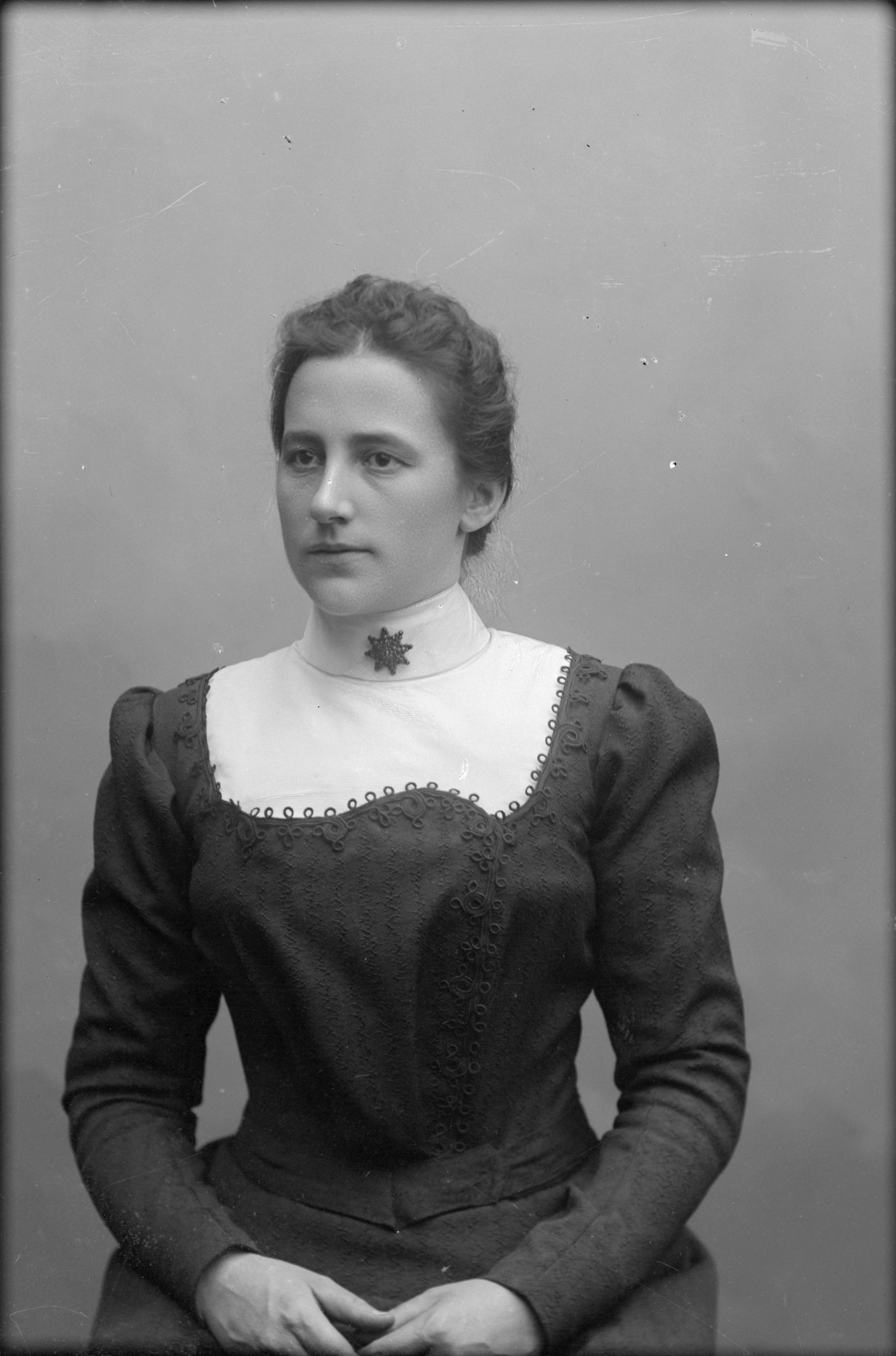 Beskrivning: Porträtt i halvfigur av Alfhilda Källman.