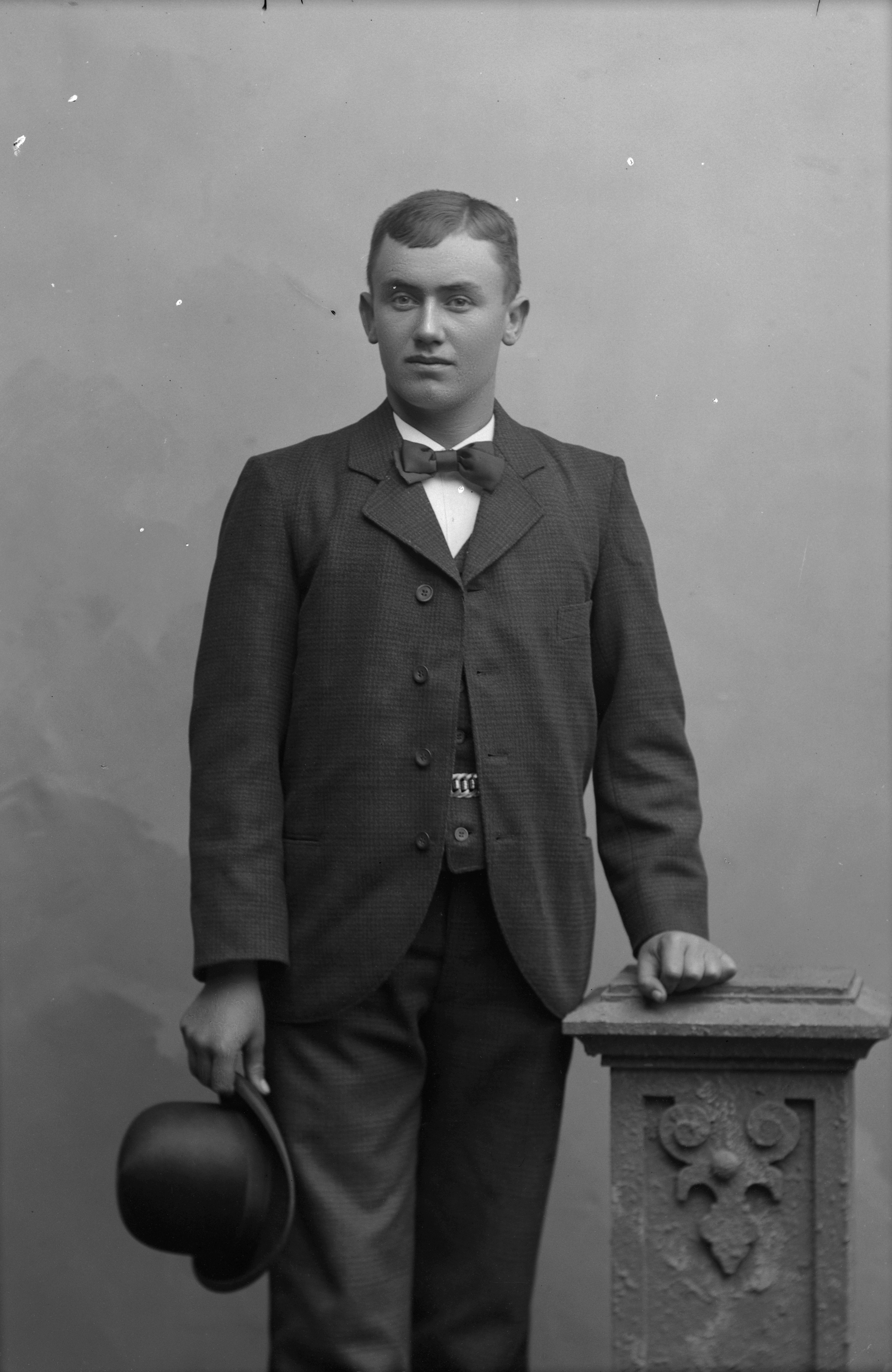 Porträtt i helfigur av O. Nilsson, hållande plommonstop i handen.