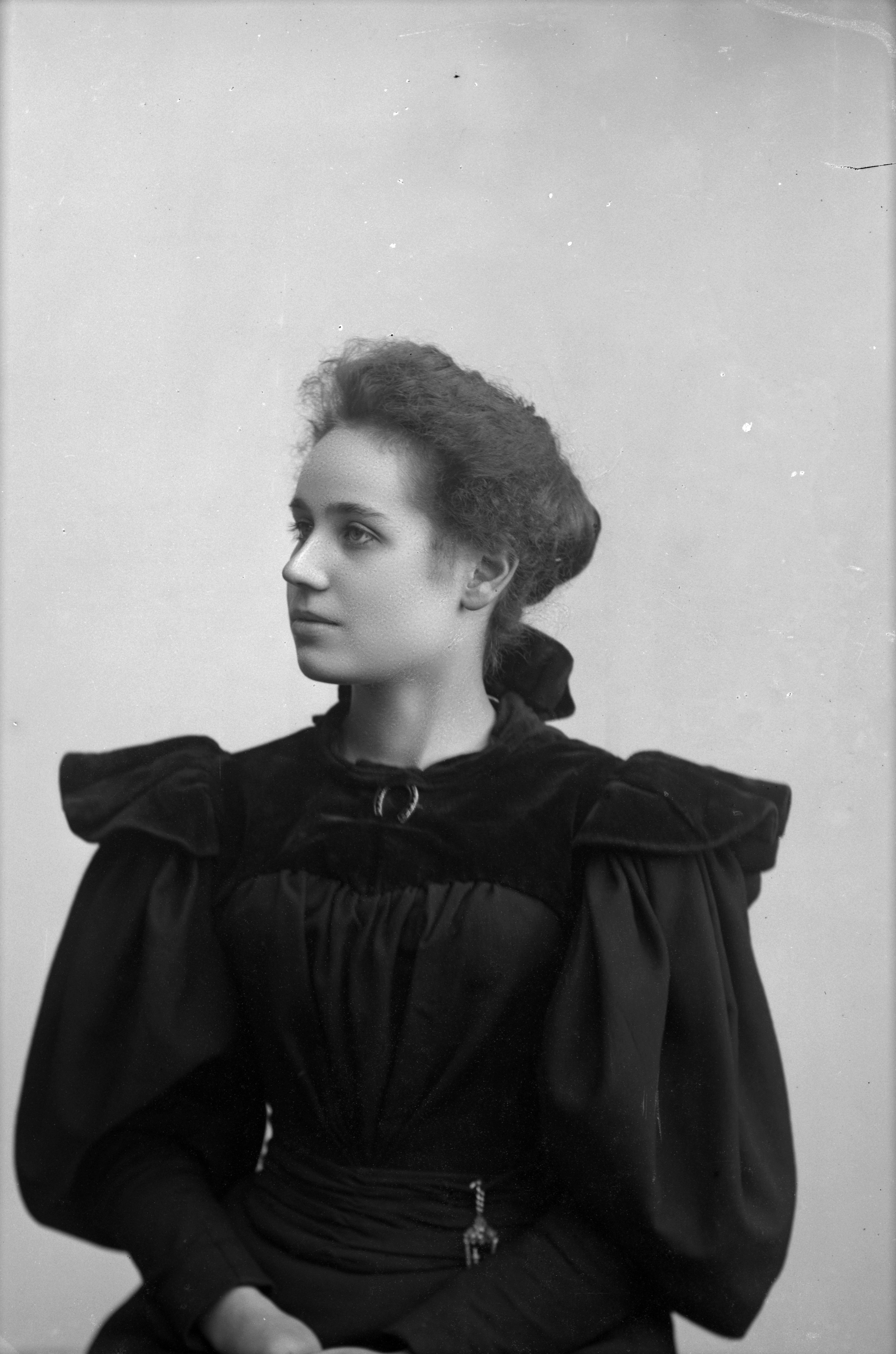 Beskrivning: Porträtt i halvfigur av fröken Fredlund.