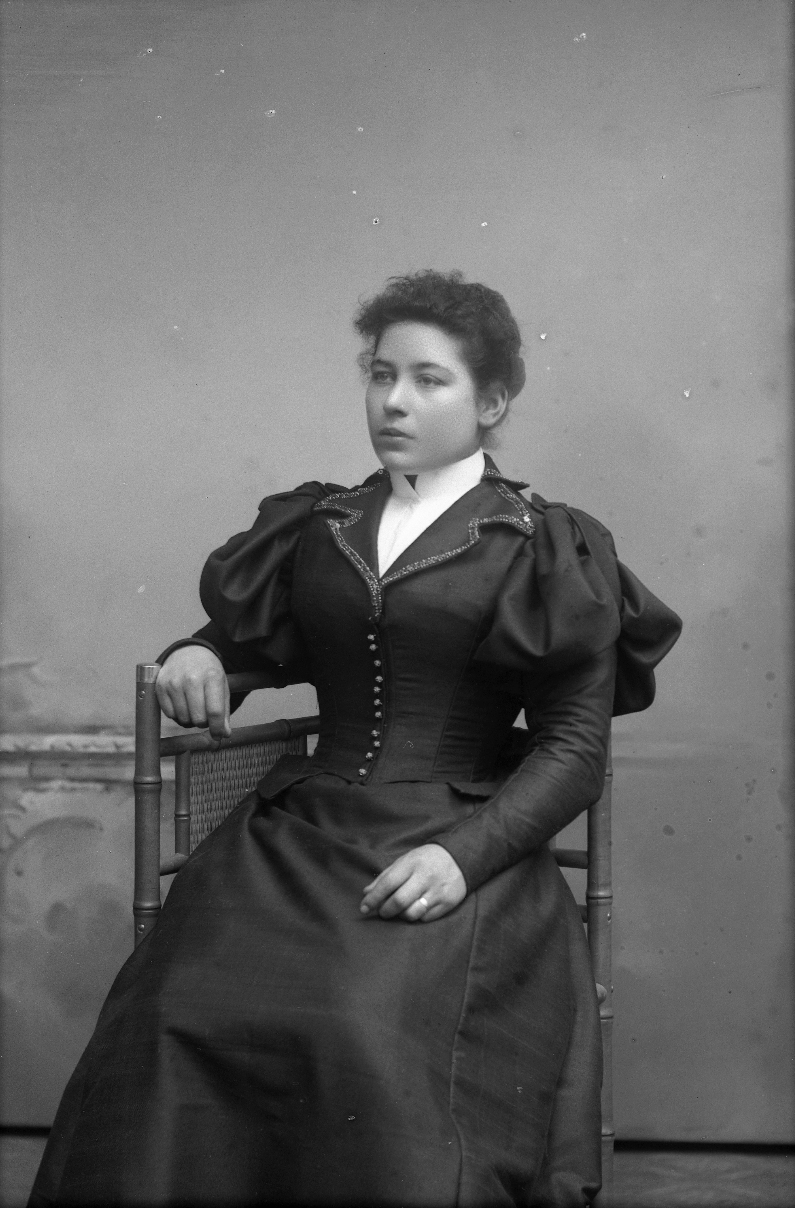 Porträtt i helfigur av Johanna Sjöbeck, sittande på stol.