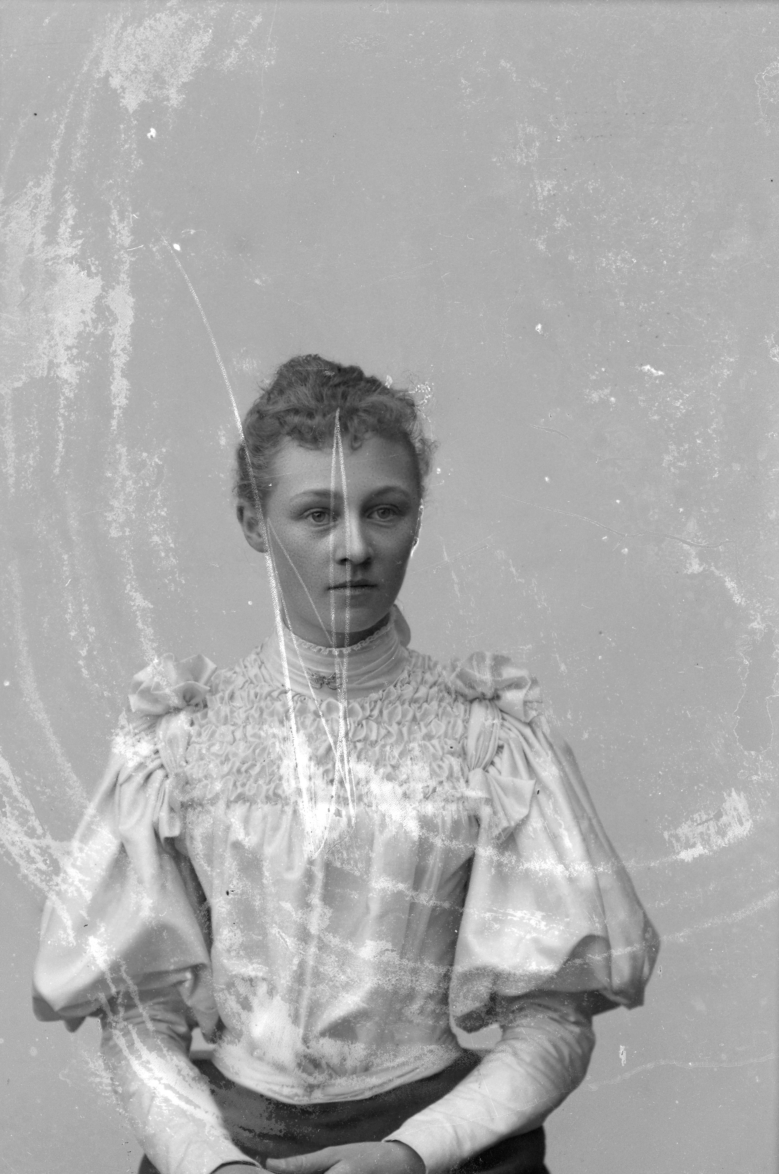Beskrivning: Porträtt i halvfigur av Jeanna Borg.