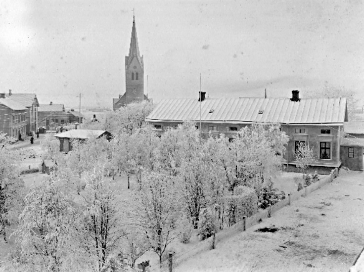 Vara köping, vy över Vara kyrka med apoteket till höger.
