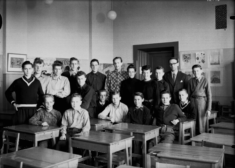 Olaus Petriskolan, klassrumsinteriör, 17 pojkar med lärare Folke Björk.