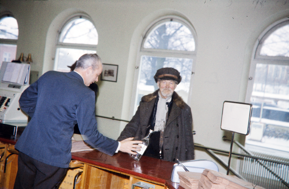 Bertil Svensson med kund på Systembolaget, Norra Järnvägsgatan, Växjö.