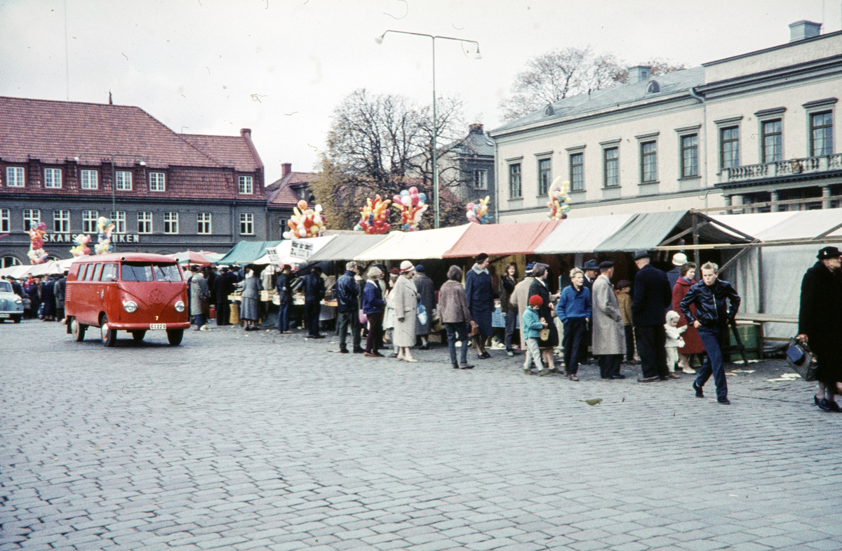 Marknad på Stortorget, Växjö. Till höger syns residenset och mitt fram några av byggnaderna längs Kungsgatan.