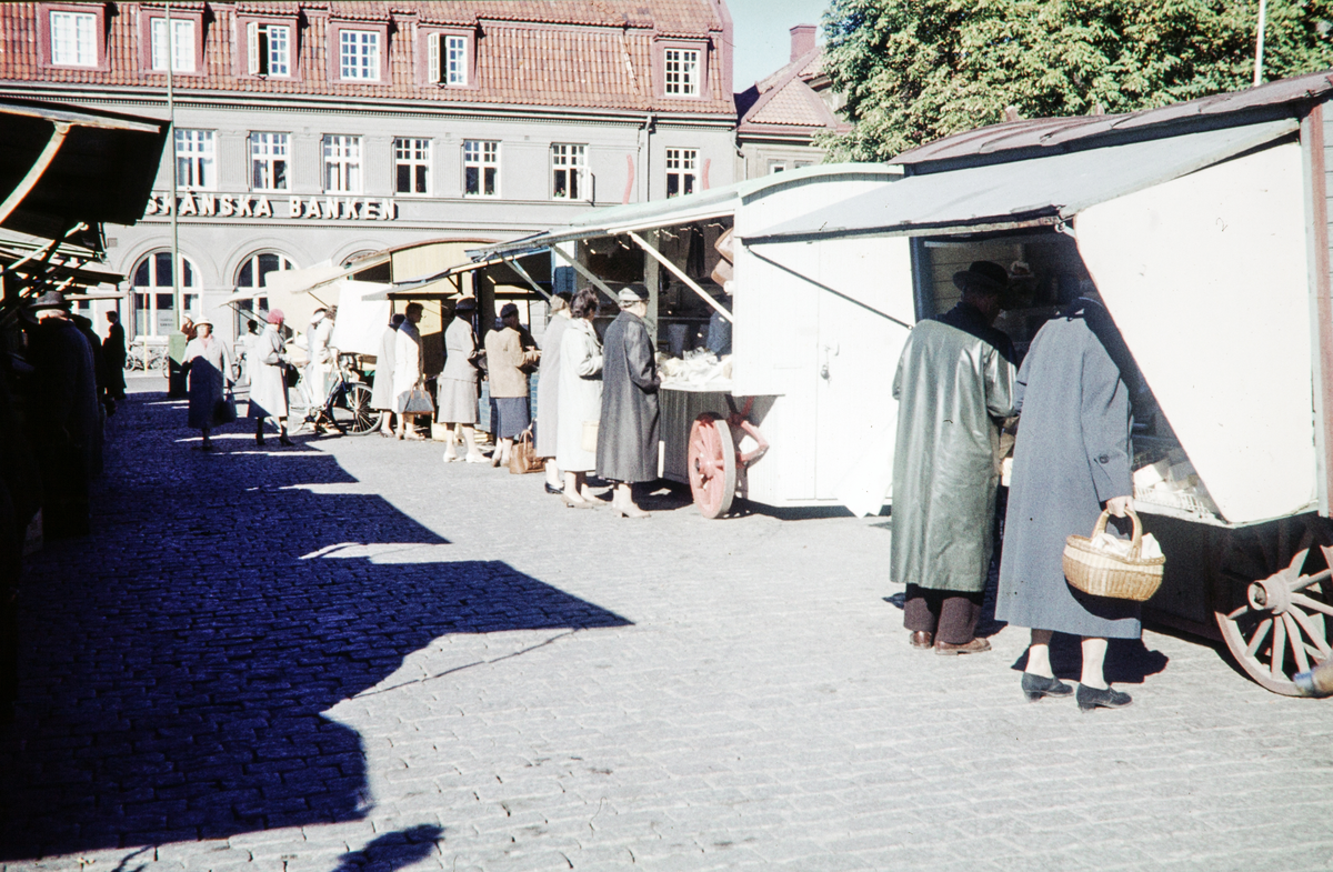 Marknadsdag på Stortorget, Växjö, västra delen. Man skymtar några av byggnaderna längs Kungsgatan.