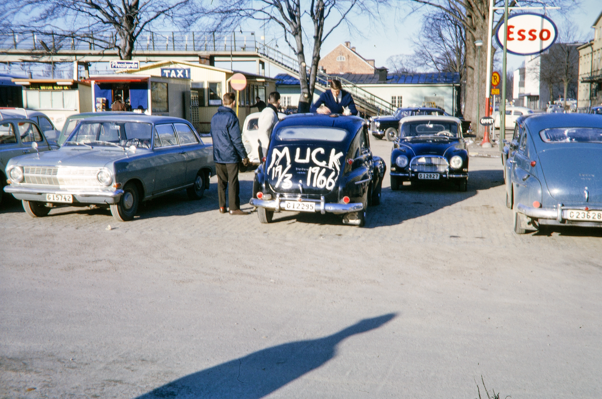 Järnvägsplan med järnvägsbron, Växjö. En bemålad "muckarbil" har stannat till. I bakgrunden skymtar några av husen längs Norra Järnvägsgatan.