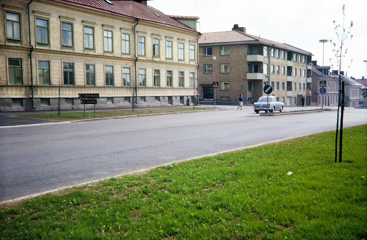 Norra Esplanaden österut, korsningen vid Kungsgatan. En kvinna är på väg att korsa gatan.
