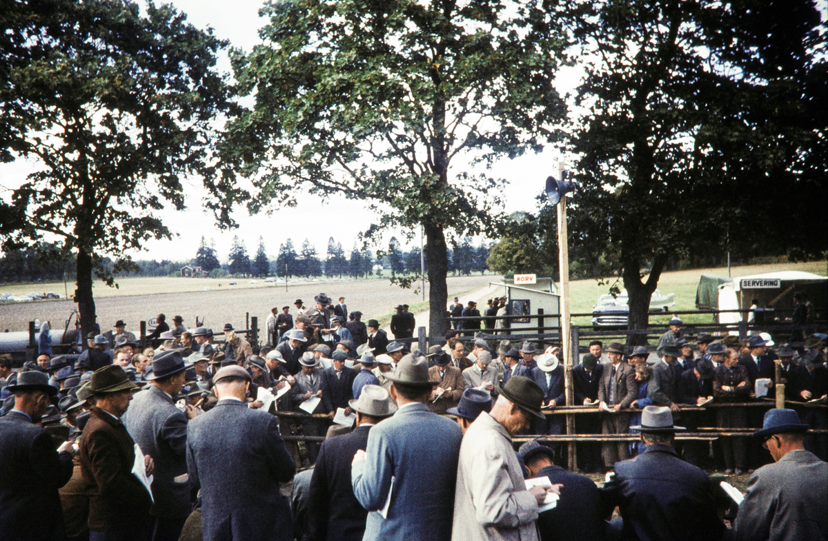 Titel: Auktion (?) vid stenladugårdarna på Teleborgs slott. Mycket folk har samlats. I bakgrunden syns granallén upp till slottet.