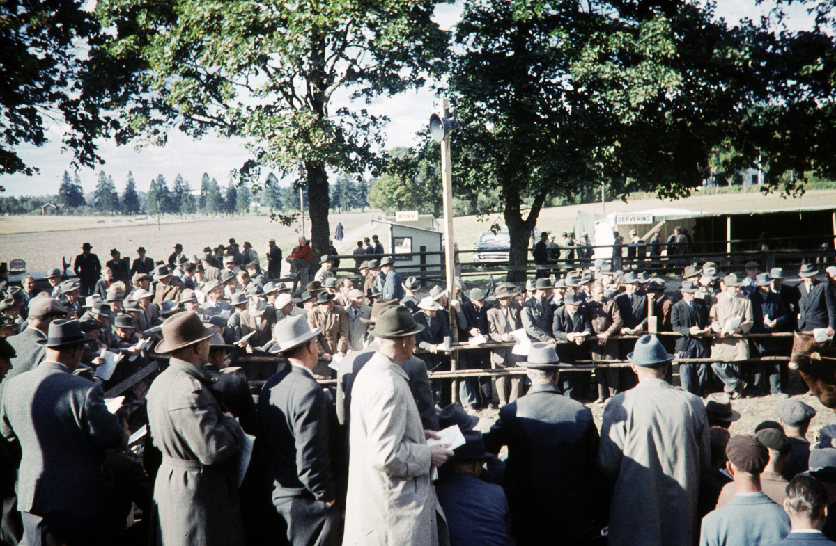 Auktion (?) vid stenladugårdarna på Teleborgs slott. Mycket folk har samlats. I bakgrunden syns granallén upp till slottet.