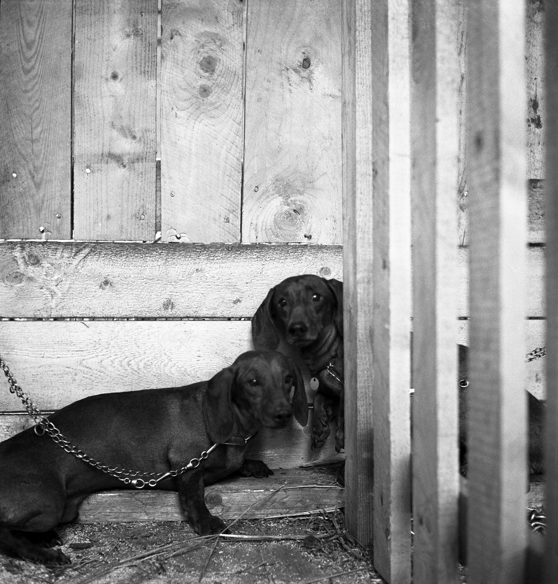 Jaktens dag och hundutställning. Två släthåriga taxar väntar på sin tur.