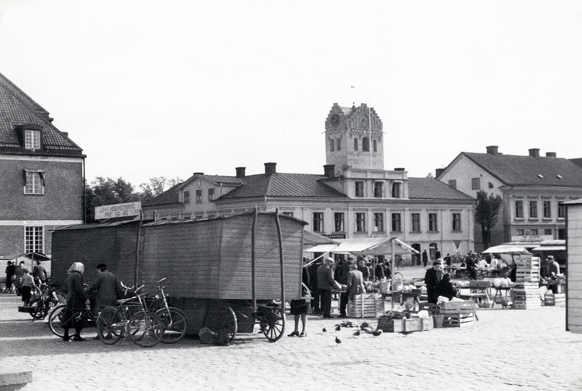 Växjö Stortorg, en torgdag på 1950-talet. Till vänster dåv. Post- och Riksbankshuset, följt av husen i kvarteret Lejonet vid Kronobergsgatan. Bakom dem syns domkyrkans torn.