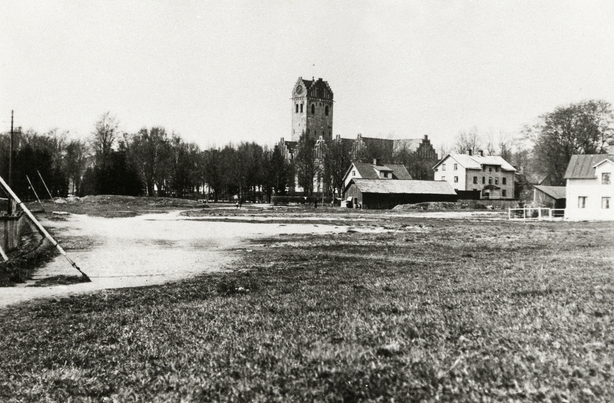 Den blivande Linnéparken med Lillsjön igenfylld, 1910. Man ser domkyrkan och sedan Gravargården till höger.