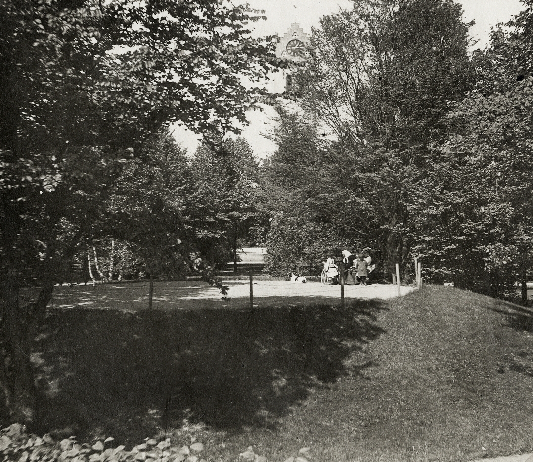 Kullen i Linnéparken, ca 1910. Två kvinnor i olika åldrar har placerat sig i solen tillsammans med några småbarn.