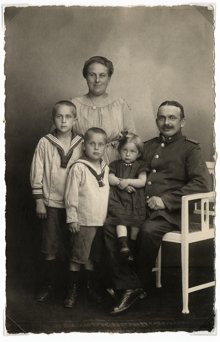 En familj med tre barn har samlats hos fotografen, ca 1915.