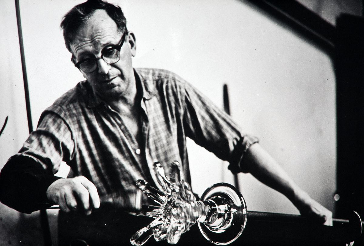 Glashyttan på ett glasbruk. En man med glasögon formar en glasskål.