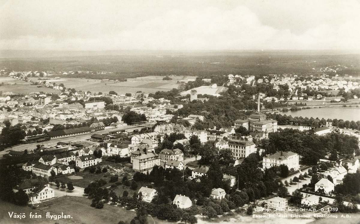 Växjö från flygplan, ca 1935-1940. Vy över Söder med kvarteren Eko, Wallqvist och Argus i förgrunden, följt av kvarteret Gustaf Adolf med Växjö flickskola och blindskolan. Där bakom syns domkyrkan och Växjö högre allmänna läroverk, med en bit av Växjösjön.
