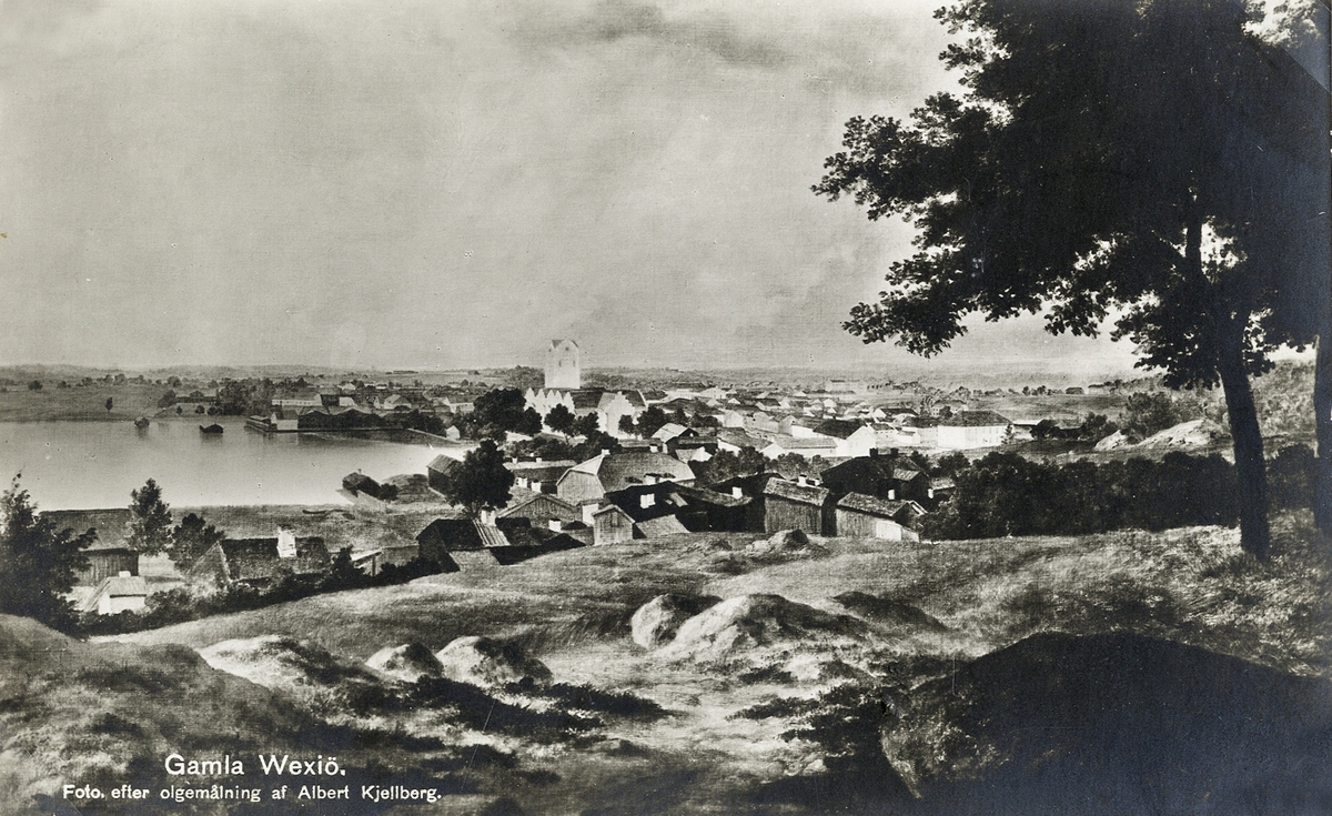 "Gamla Wexiö". Foto efter oljemålning av Albert Kjellberg, ca 1850. Vy från Öster (Staglaberget).