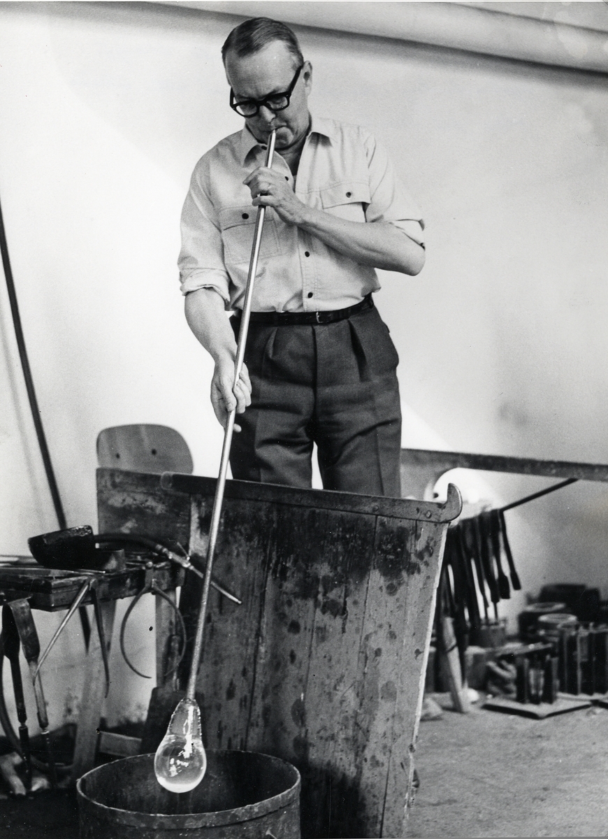 Intendent Henning Eklund blåser glas på Kosta glasbruk, ca 1960.