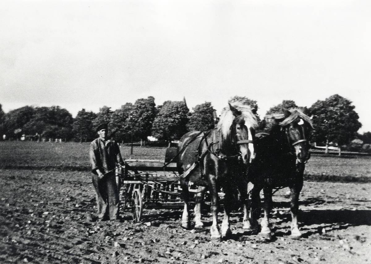 Sådd på en åker vid Teleborgs slott. En man kör med två hästar. 1940-tal.