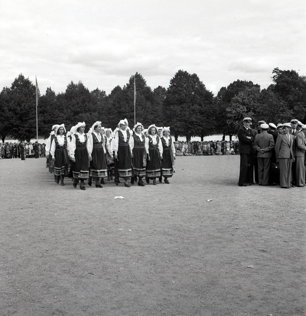 Ett antal kvinnor i Värendsdräkt tågar in på planen framför