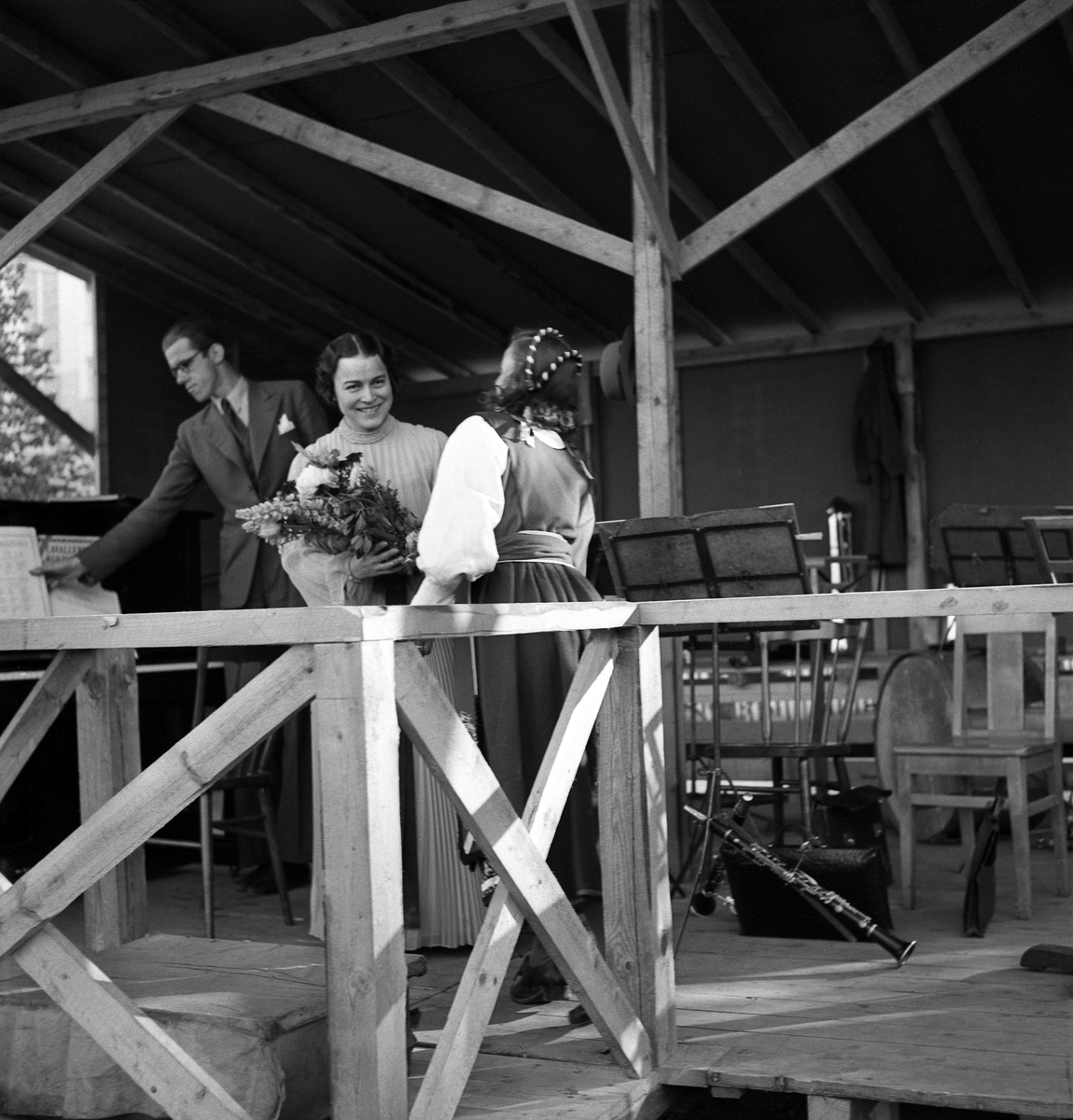 Nykterhetsfolkets dag. En sångerska (?) får blommor av en ung kvinna i Värendsdräkt.