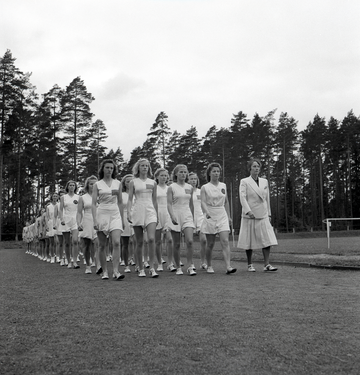 Intåg av kvinnliga gymnaster på Värendsvallen under Gymnastikens dag.