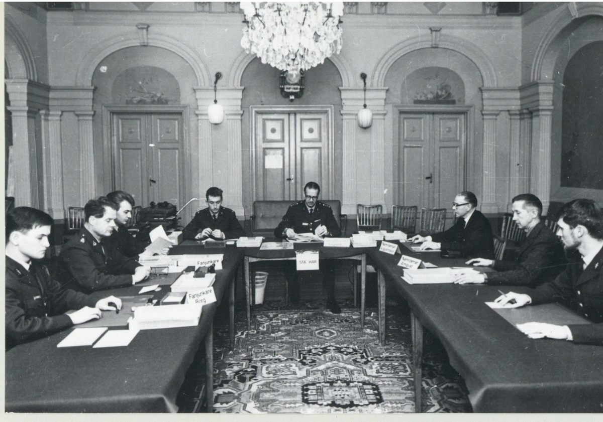 Inskrivningsnämnden med biträden. Flustret 1964. Fr v Göran, fanj Dolk, vpl Carlsson, vpl Liljeholm, överstelöjtnant Englund, nämndeman Augustinsson, nämndeman Almqvist och vpl Hjalmarsson.
