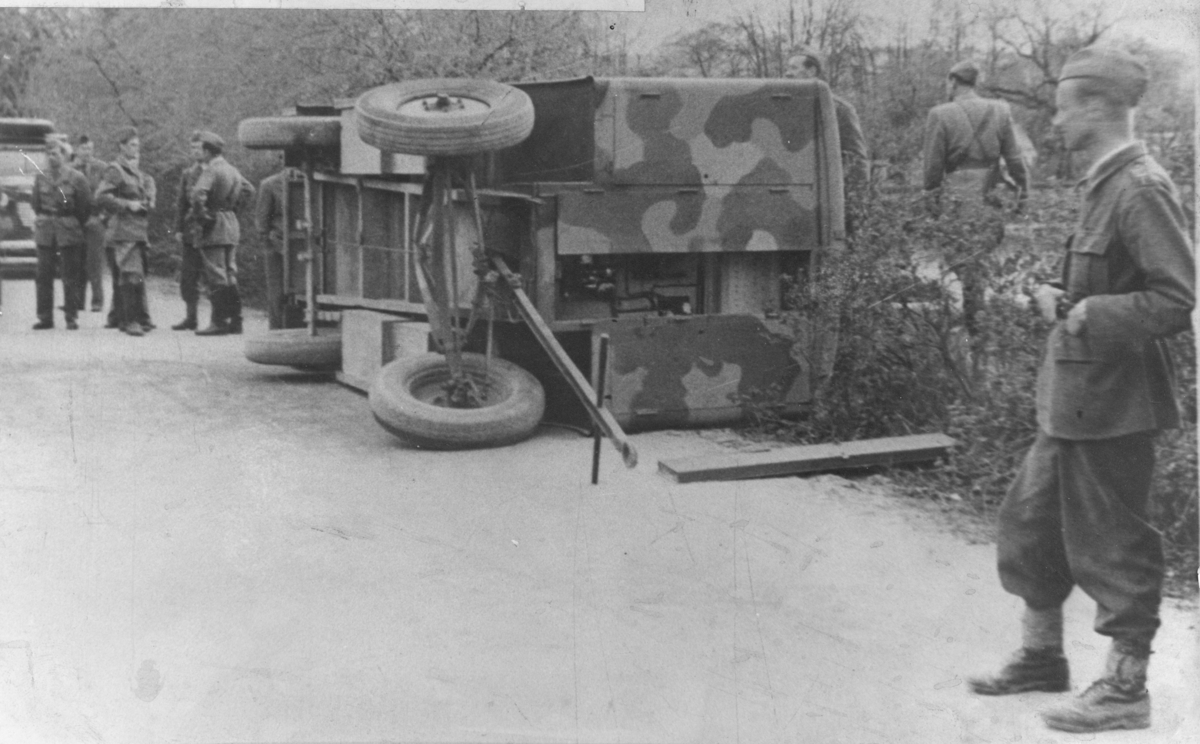 Omkullvält BF-vagn 1949.Denna bärfrekvensvagn har icke vält av materialfel utan därför att föraren i dragfordonet haft för hög hastighet. Kurvan känner Du väl till och hastigheten man kan komma upp till är ej överdrivet hög. Trots detta kan släpvagnar av detta slag mycket lätt välta. Du måste köra dessa släp försiktigt aldrig slänga om ratten för snabbt och aldrig bromsa häftigt. Släp av denna typ kränga dessutom starkt. På smala vägar måste Du stanna när någon vill köra om. E. Gustafson