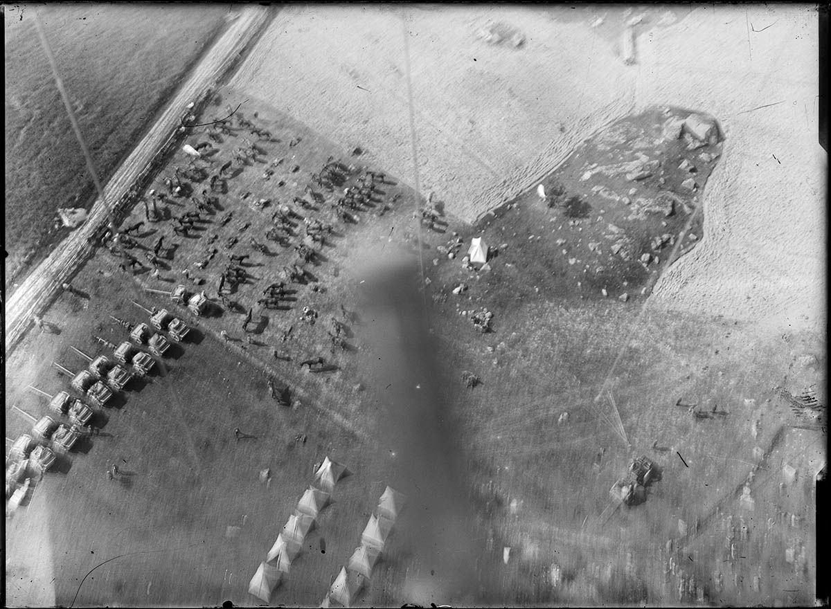 Titel: Ballongövningar omkring 1908. Fotografi över förläggningsområde tagen från ballong